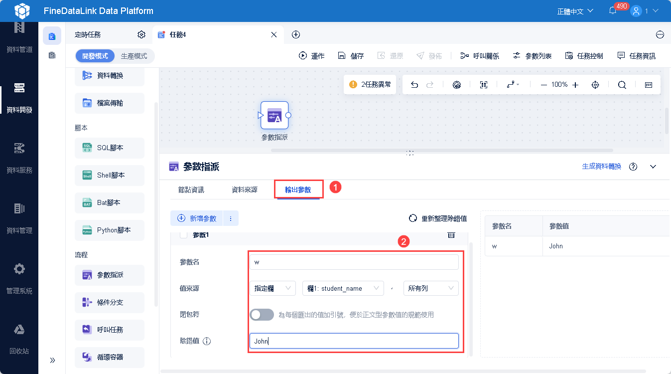 Python 腳本中接收的參數名為 w,所以此處參數名也為 w ;取出第一欄所有行的資料;預設值只是為了下游節點提前預覽設定的,實際運作時不會用到這個預設值,直接從右側的「參數預覽」中複製即可。