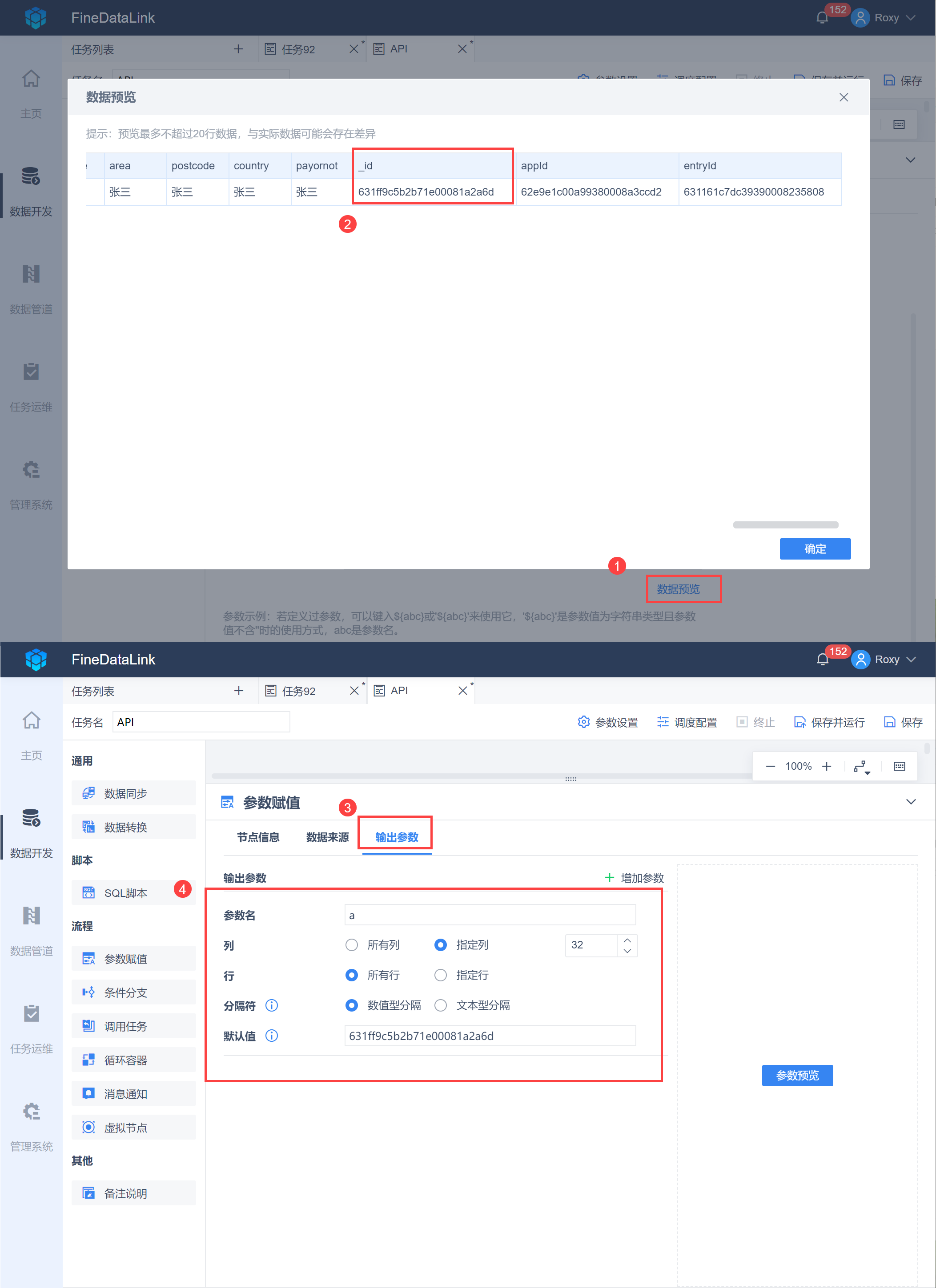 点击「数据预览」即可查看到返回的响应数据,根据 1.2 节方案,需要将响应数据中的 ID 字段设置为参数,如下图所示: