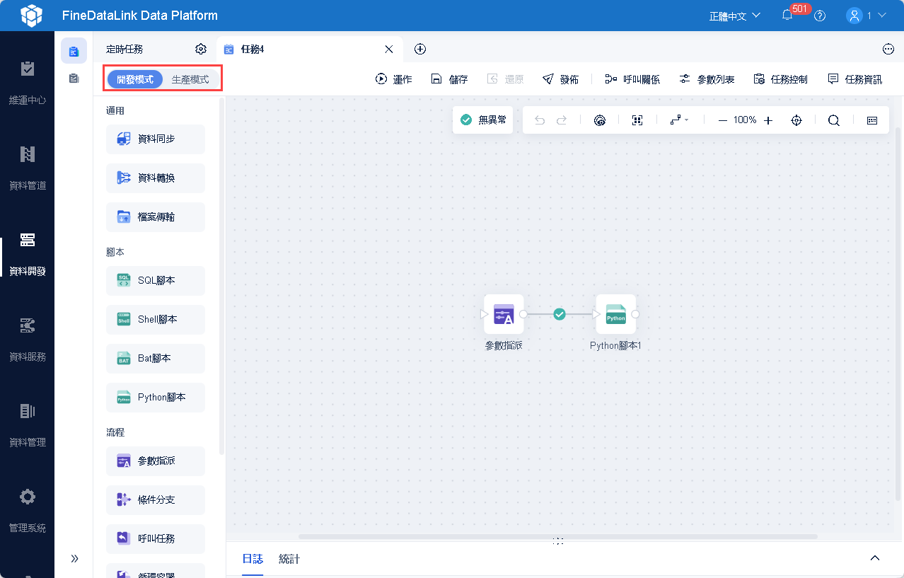 開發模式相當於任務的測試環境,使用者可進行任務的設計編輯;所有的修改都不會影響生產模式的任務;開發模式的任務,可發佈到生產模式。