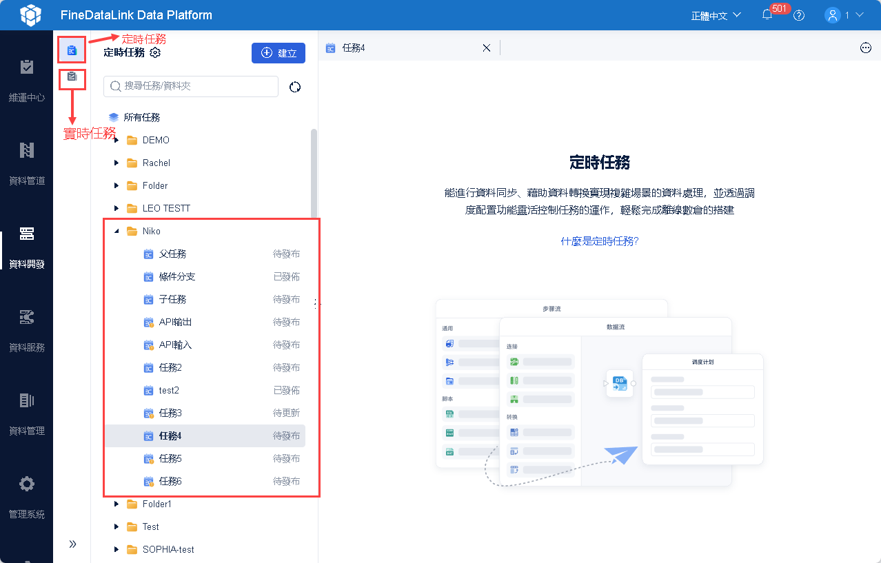 定時任務中,支援在視覺化介面使用各個節點和算子進行資料的抽取、轉換和裝載,並可以透過排程管理功能自動運作定時任務,幫助您輕鬆構建離線數倉,保證資料生產的高效穩定。