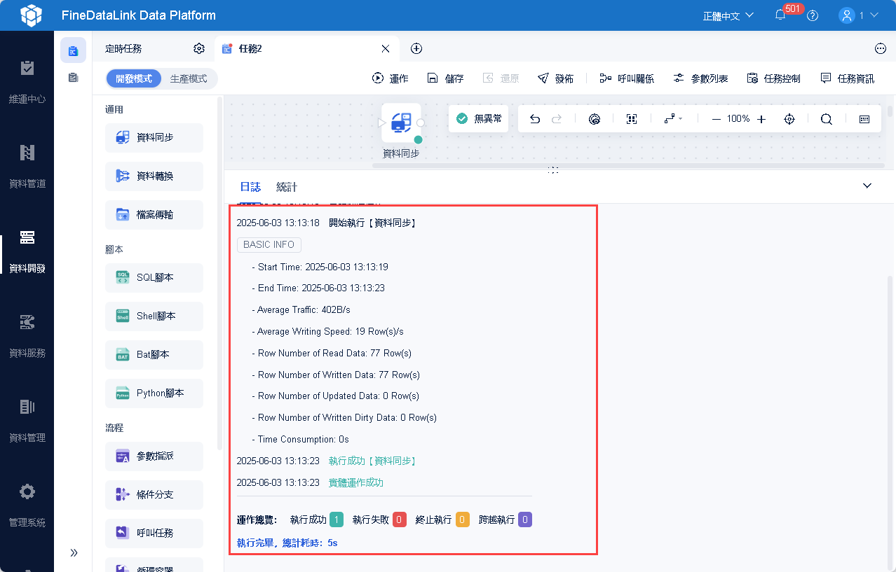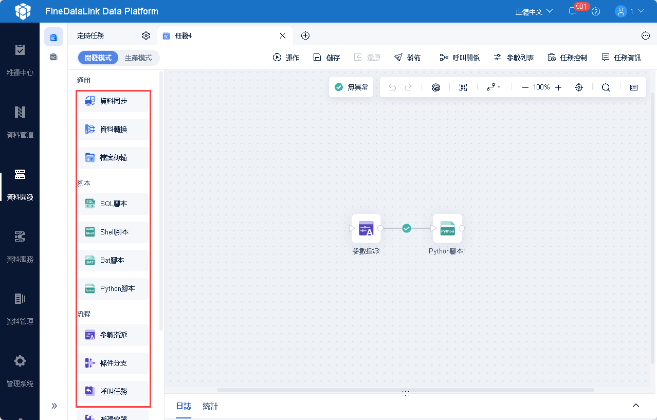 | 通用 | 資料同步 | 基礎 | 快速完成資料同步(輸入、匯出),不支援在資料同步程式中做資料轉換 | 支援多種類型的取數方式:API 取數、SQL 取數、檔案取數等。由於無程式中的資料處理,所以不需要記憶體計算,適用於: