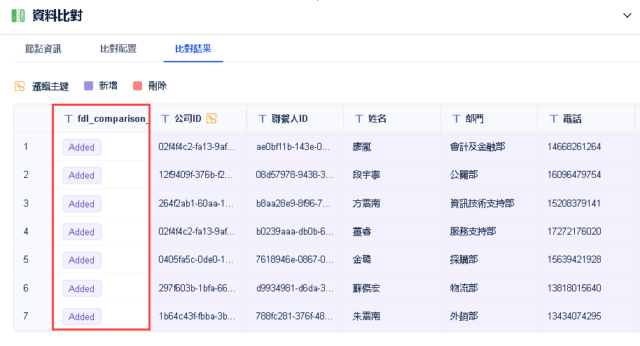| 比對刪除 | 將來源表中「資料刪除」這一變化同步至目標表 | 透過欄位值對比,對目標表中存在,但是輸入源中不存在的資料行進行刪除。包含: