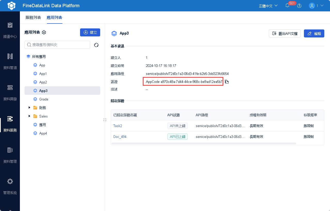 FineDataLink 特有的 API 鑑權認證方式。APPCode可視為長期有效的一種Token。若設定後對指定應用 API 生效。