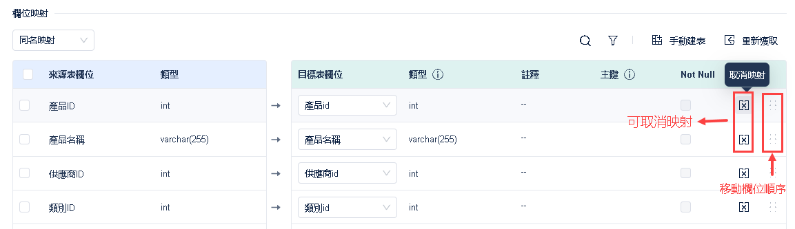 欄位映射就是建立「來源端-目標端」的欄位對應關係。詳情請參見:設定欄位映射