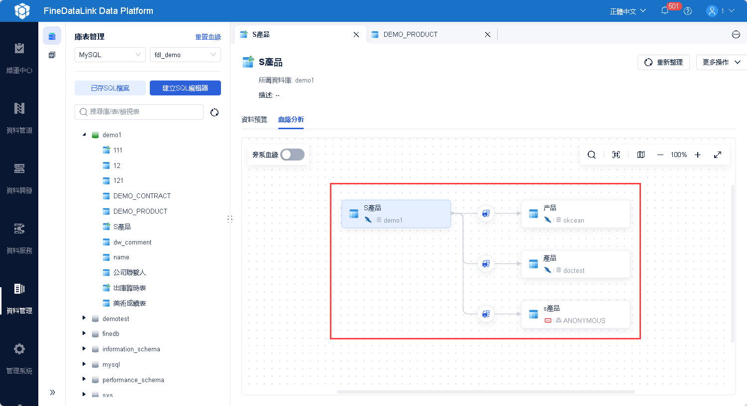 2)血緣分析: 可查看資料開發任務、管道任務、資料服務中,所使用表的血緣關係 |