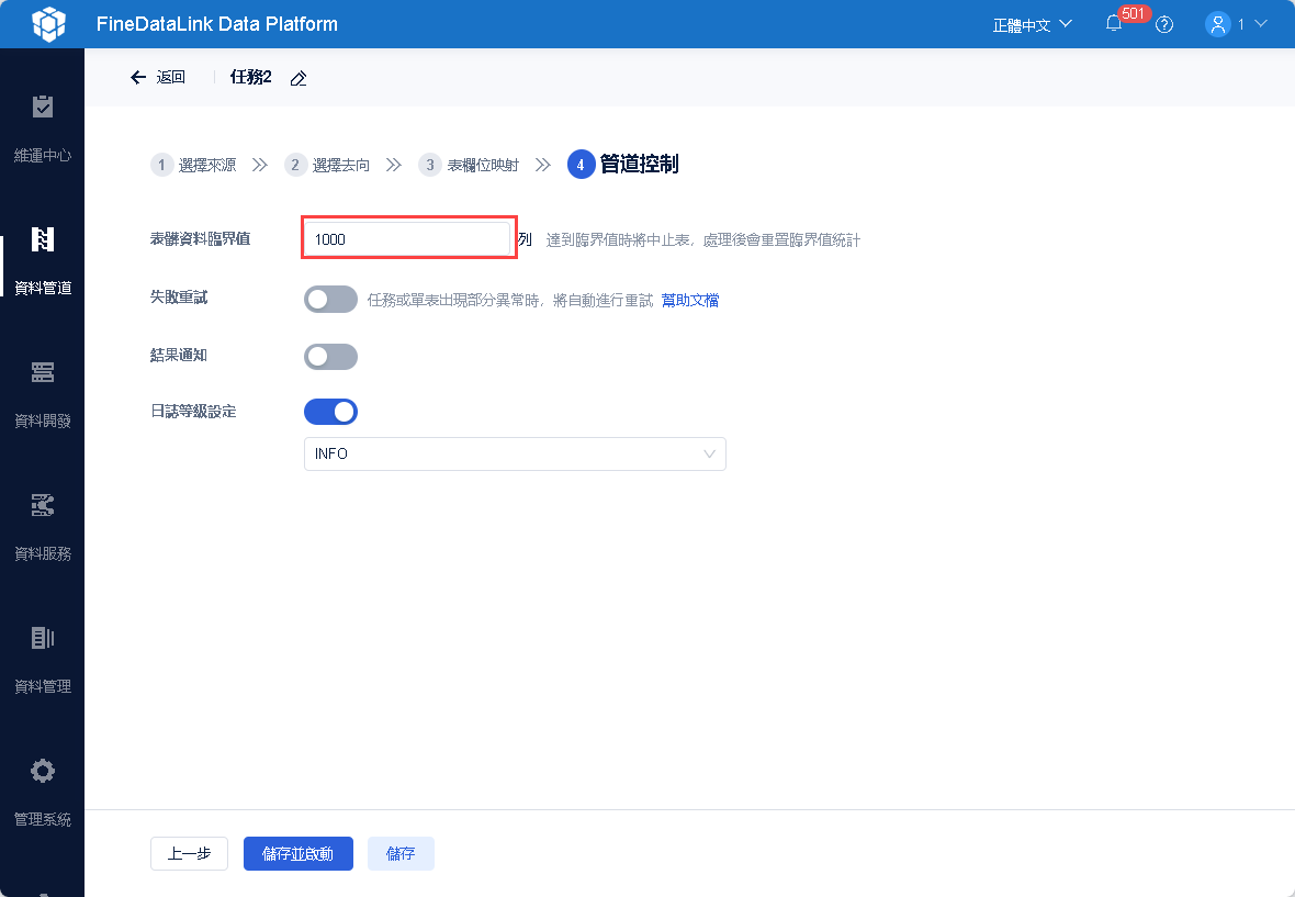 管道任務中日誌級別說明請參見:配置管道任務-管道控制