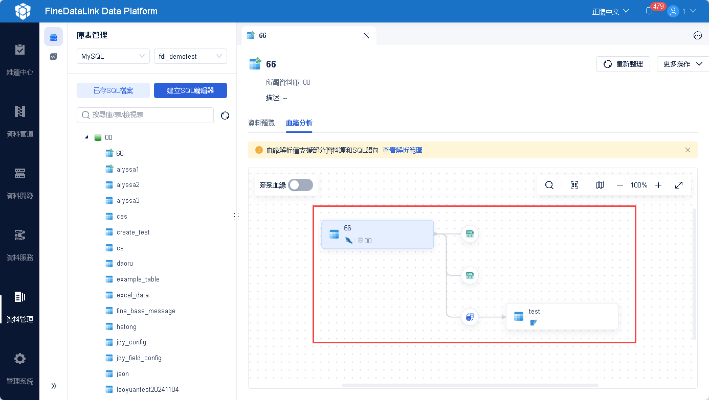 進入資料管理後,找到管道任務中的一個資料表 DEMO_PRODUCT,點選「血緣分析」,即可看到管道任務資料表的血緣,如下圖所示: