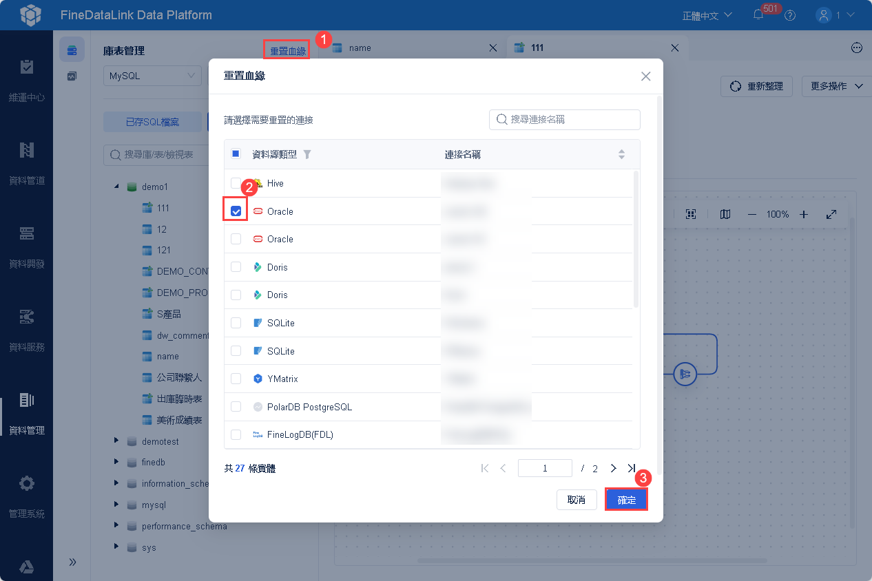 1)點選「重置血緣」按鈕,支援多選資料連結,如下圖所示: