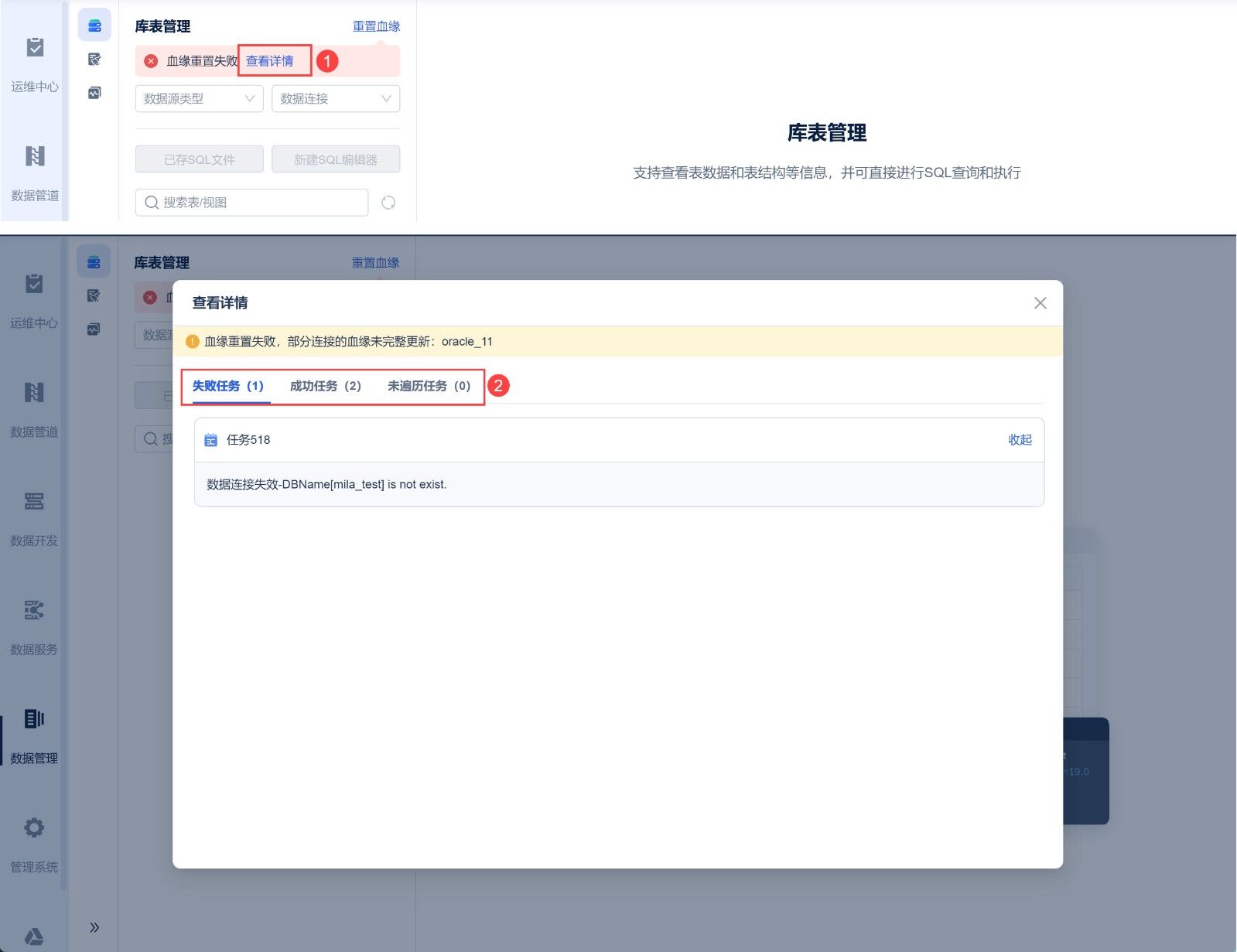 若血緣重置失敗,支援查看任務詳情。在彈窗中支援血緣重置失敗任務、成功任務、未遍歷任務。如下圖所示:
