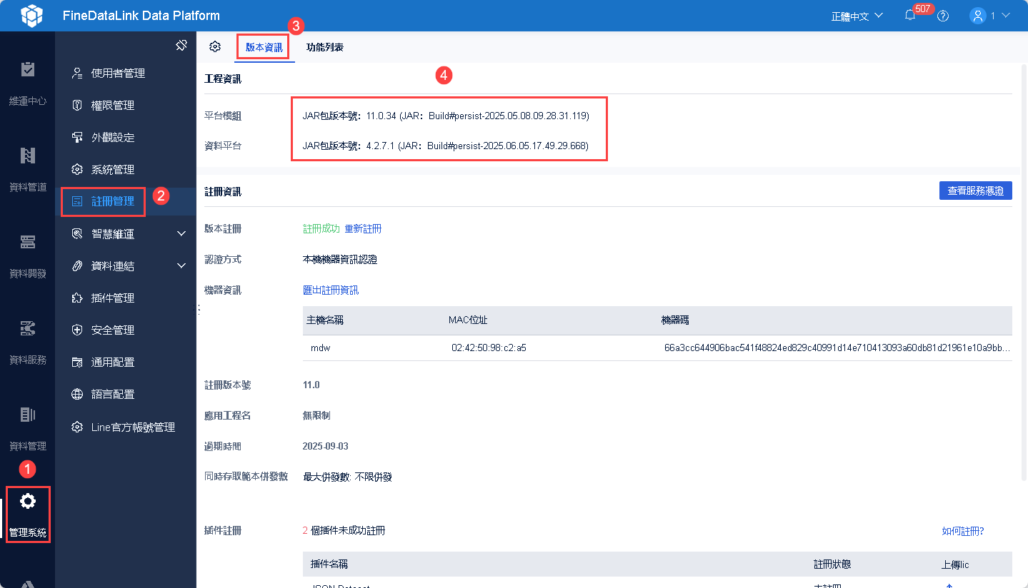 版本情況可在「管理系統>註冊管理」中查看版本情況,如下圖所示:
