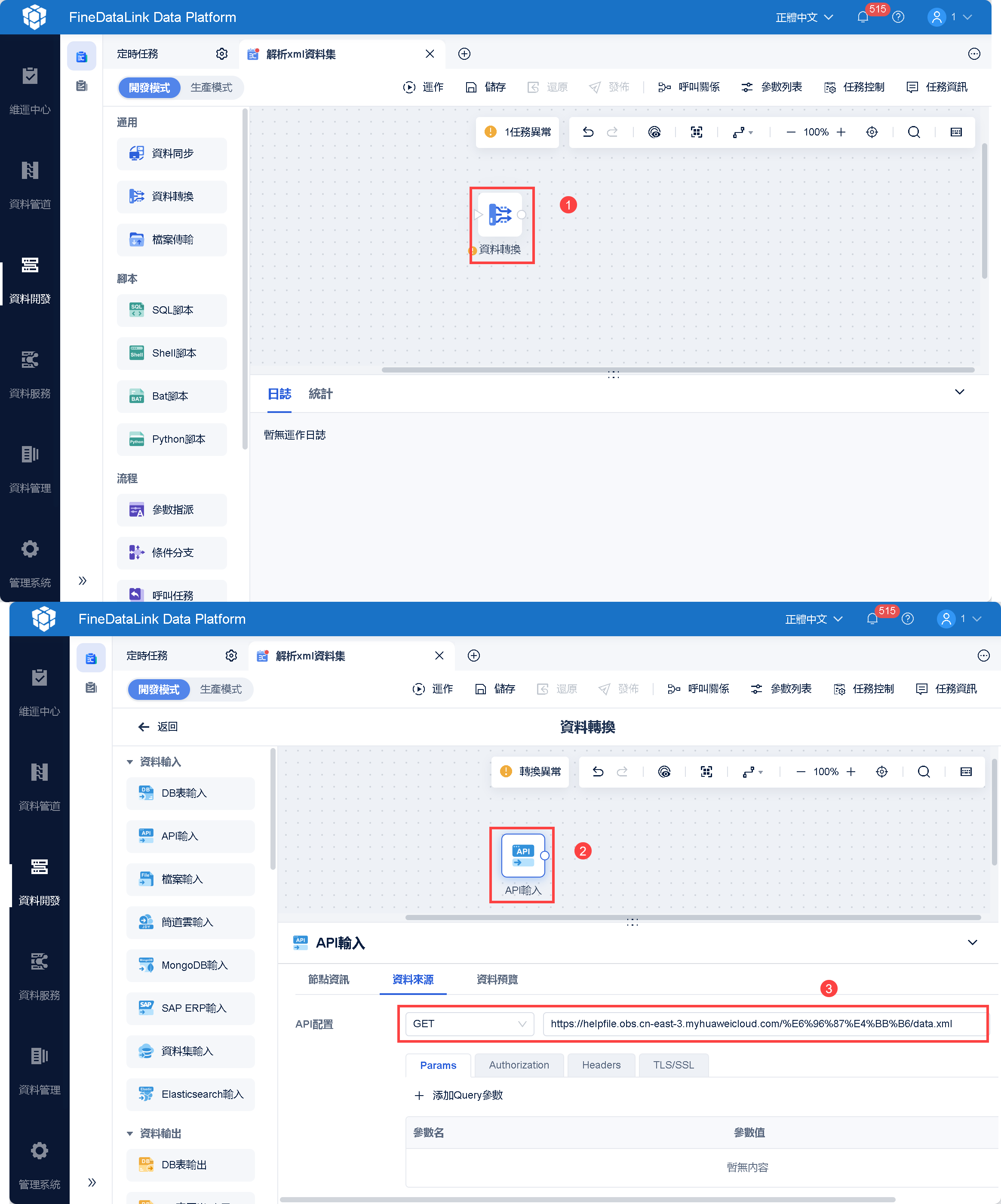 建立定時任務,並新增「資料轉換」節點,使用「API輸入」算子讀取上傳的 xml 檔案地址並獲取資料,如下圖所示: