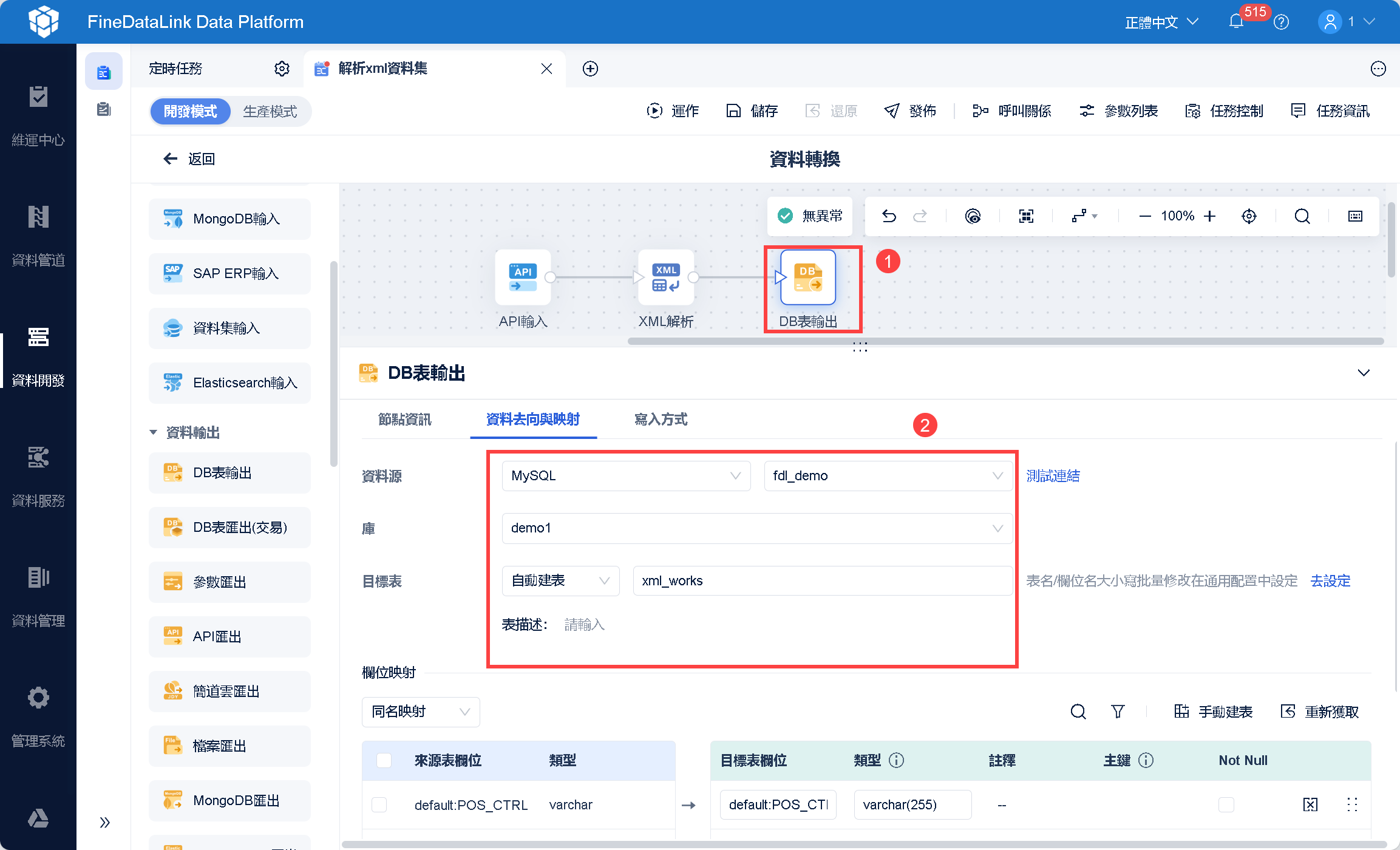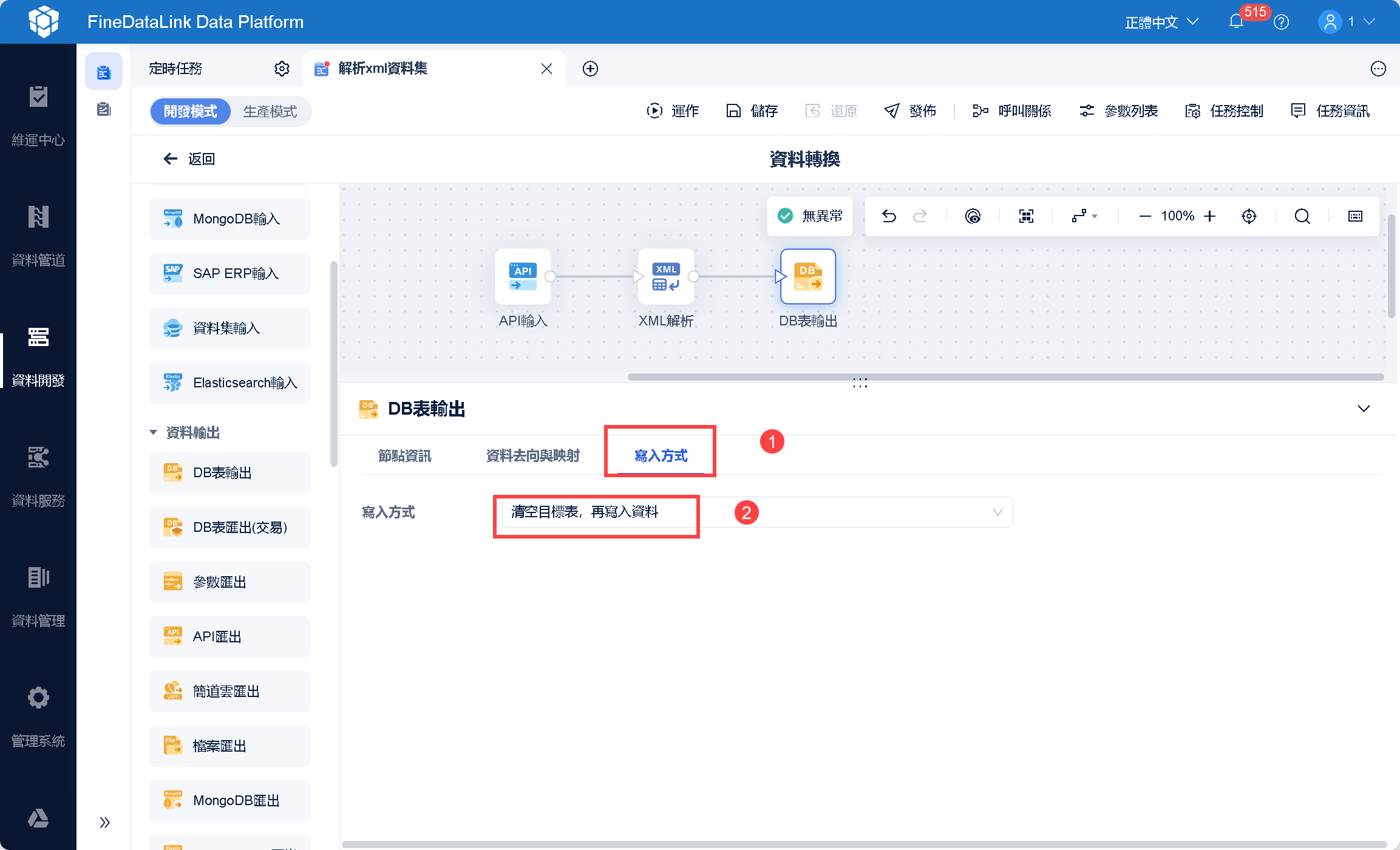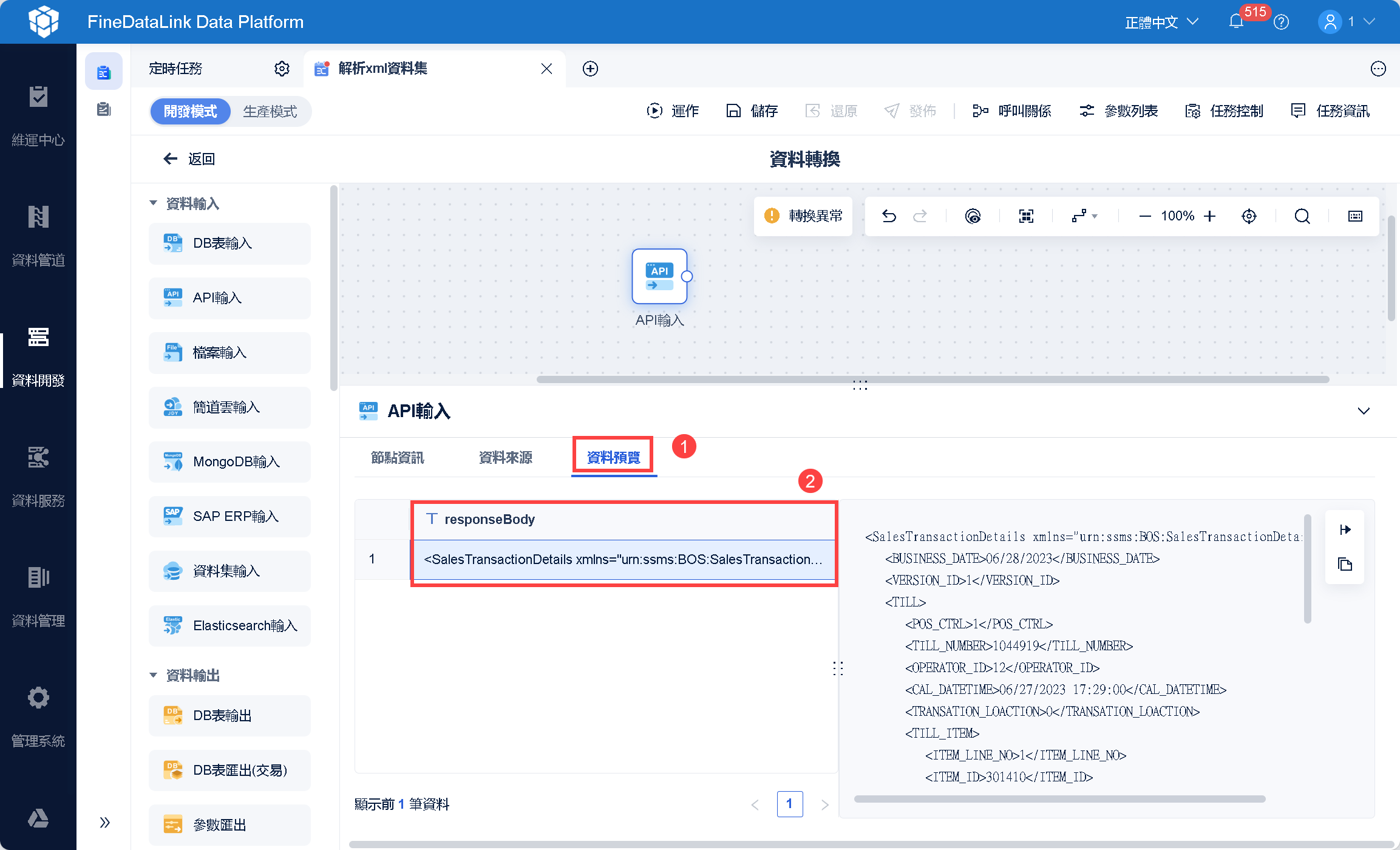 然後使用 API输入功能,存取 XML 檔案,並使用 XML解析算子將資料解析資料並落庫。