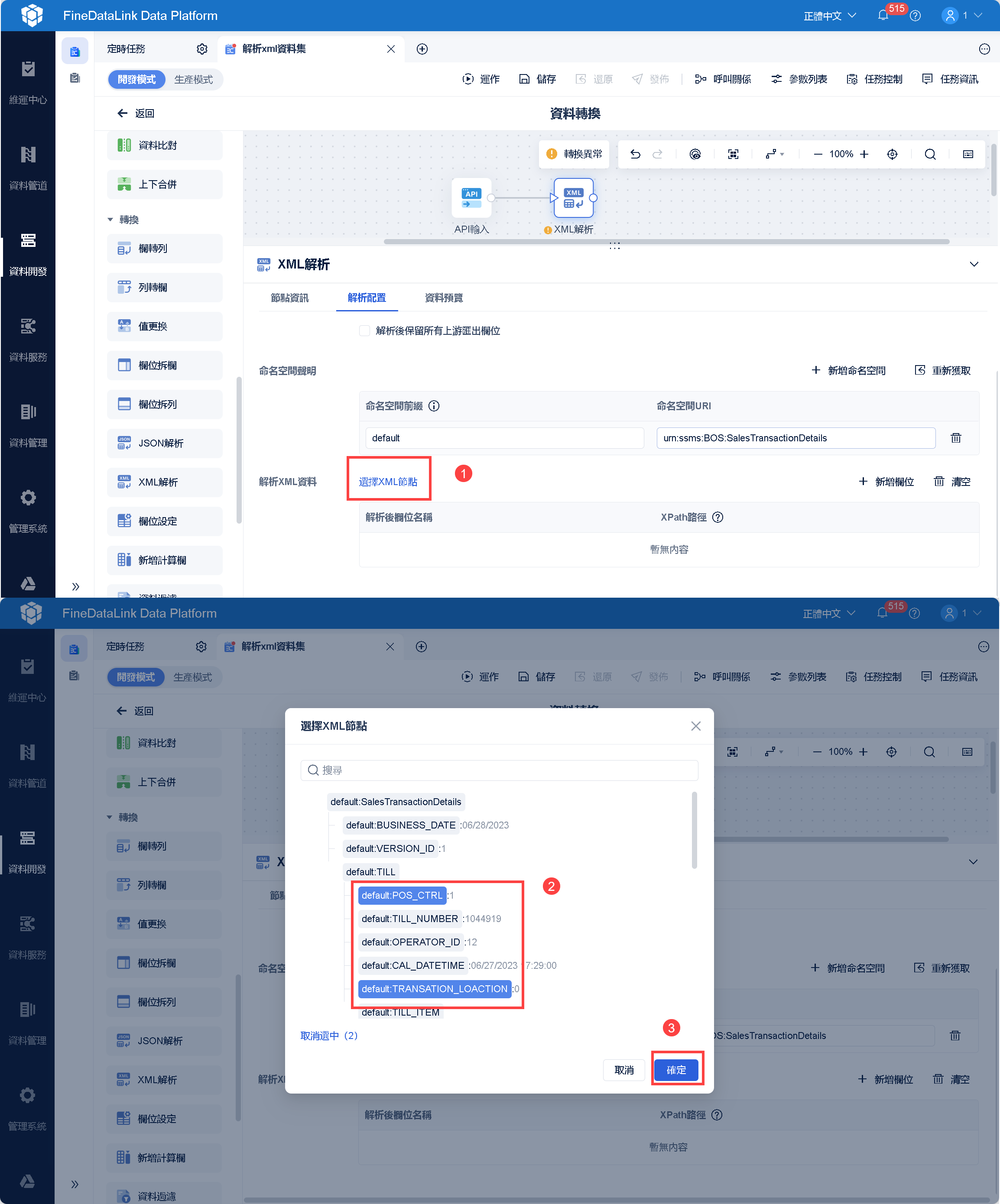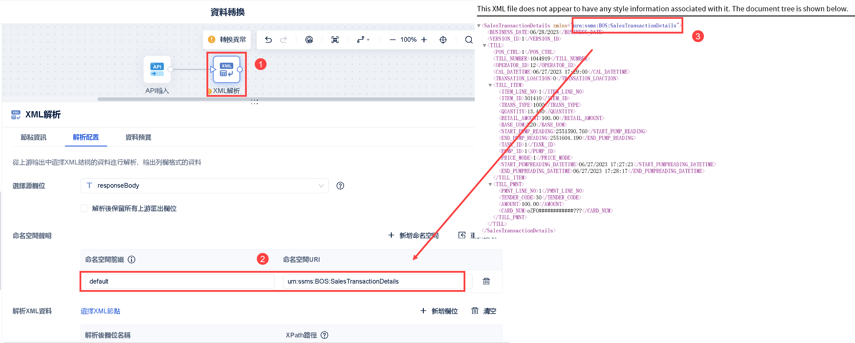 使用「xml解析」算子,解析xml資料,按照讀取的 XML 內容新增命名空間,如下圖所示: