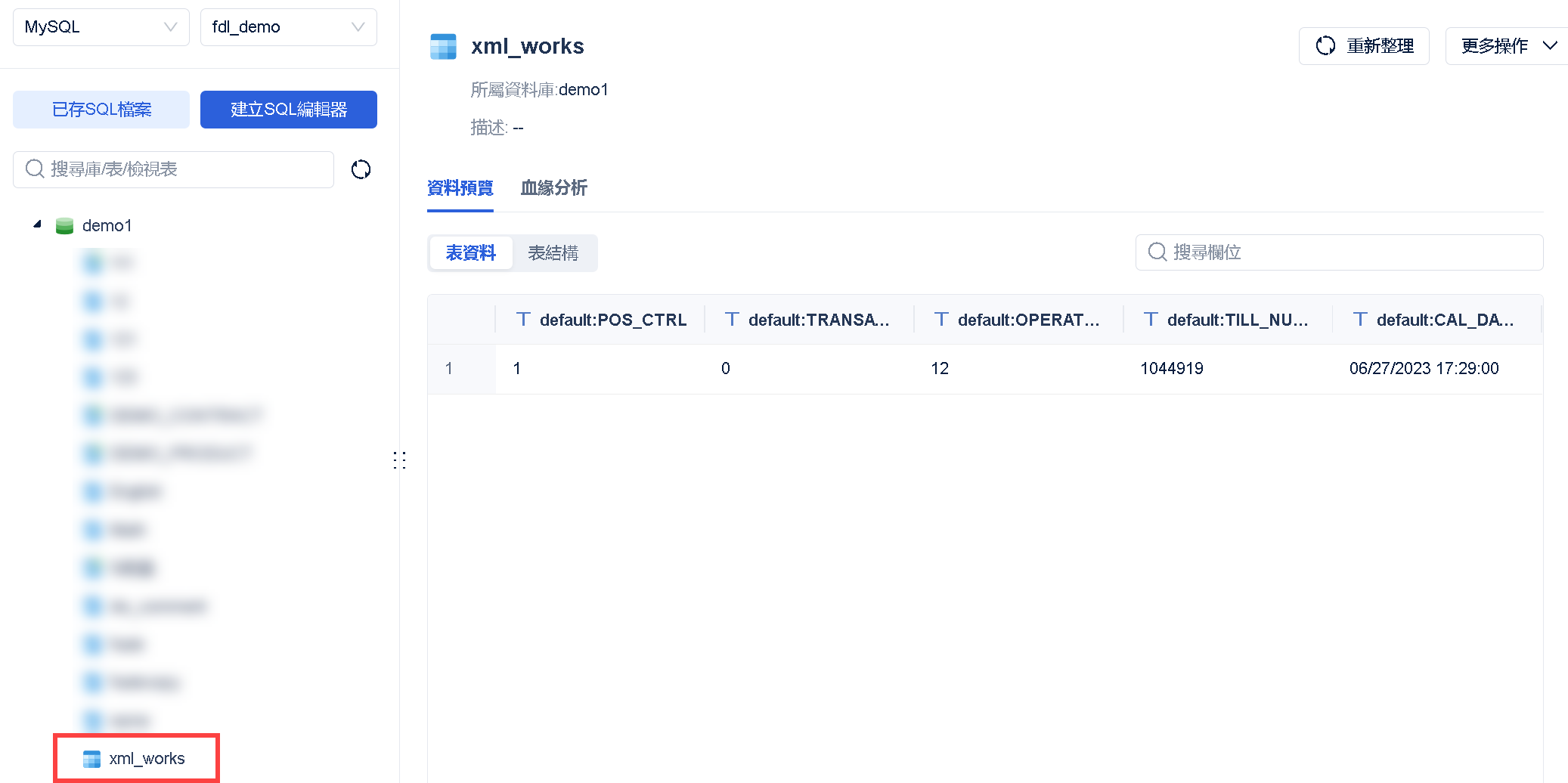 儲存並運作任務後,即可在資料庫中看到落庫的 XML 檔案資料,如下圖所示: