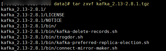 使用命令 tar zxvf kafka安裝包檔案名稱.tgz 解壓安裝包,例如如下圖所示: