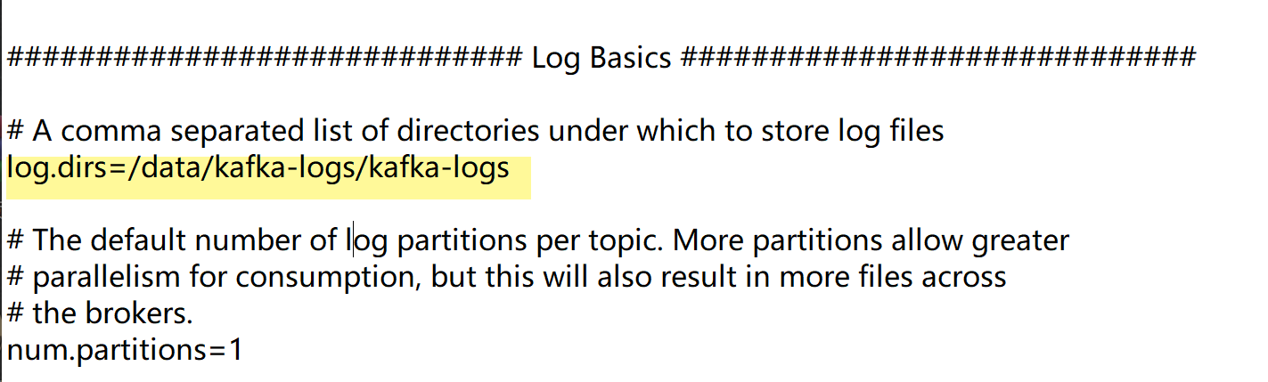 開啟 Kafka 安裝目錄下的 config 檔案中的 server.properties 檔案,找到 log.dirs=,修改資料儲存位置,把等於號後邊的值取代為建立好的給 Kafka 儲存資料的目錄,修改之後儲存。如下圖所示: