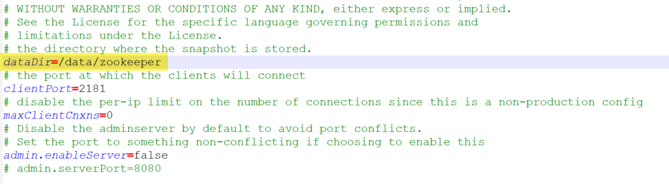 開啟 Kafka 安裝目錄下的 config 檔案中的 zookeeper.properties 檔案,找到 dataDir=,修改資料儲存位置,把等於號後邊的值取代為建立好的給 Kafka 儲存資料的目錄,修改之後儲存。如下圖所示: