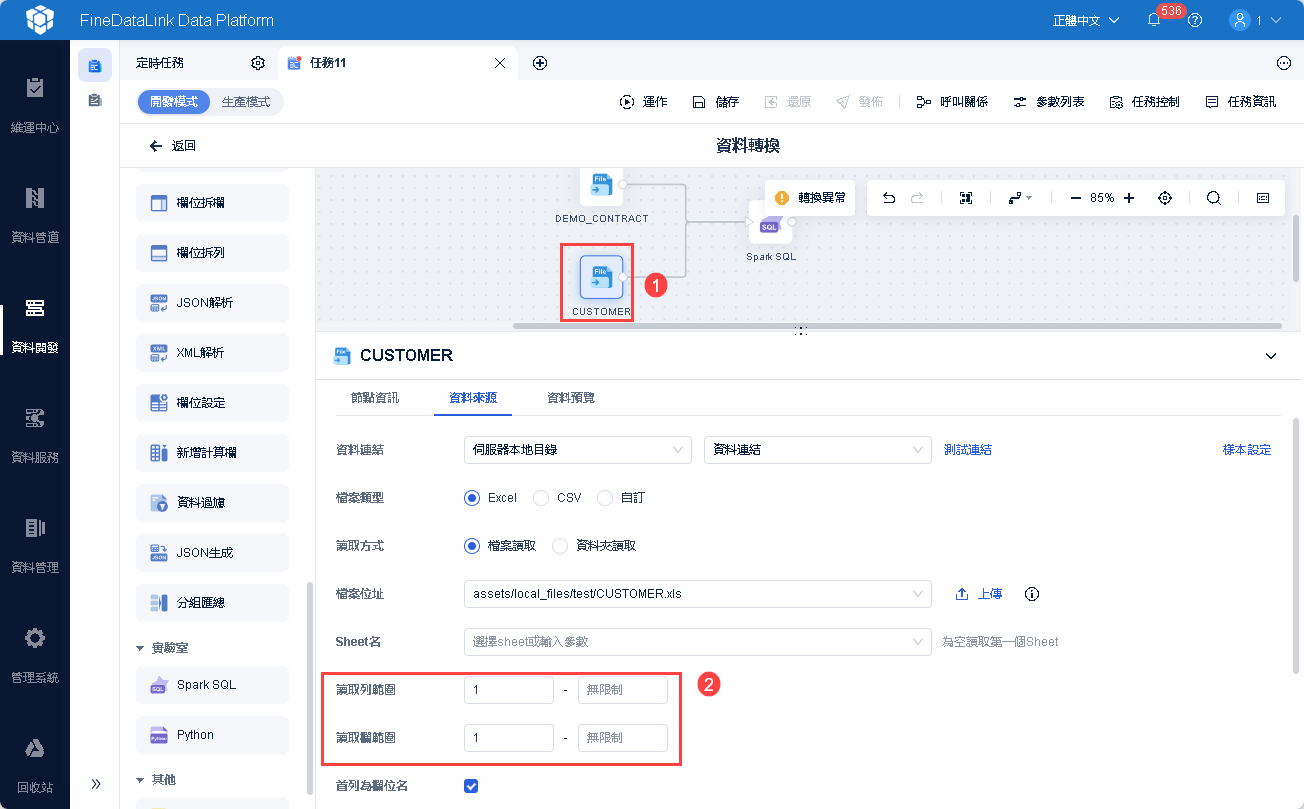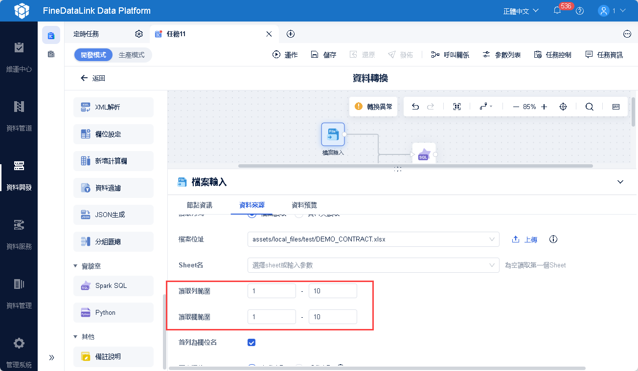 | 資料轉換 | 檔案資料集(解析首行)、API取數解析(解析整段)、MongoDB取數(前100行)、檔案輸入(前5000行) JSON解析(解析選擇欄位的首行)、XML解析(解析選擇欄位的首行) |