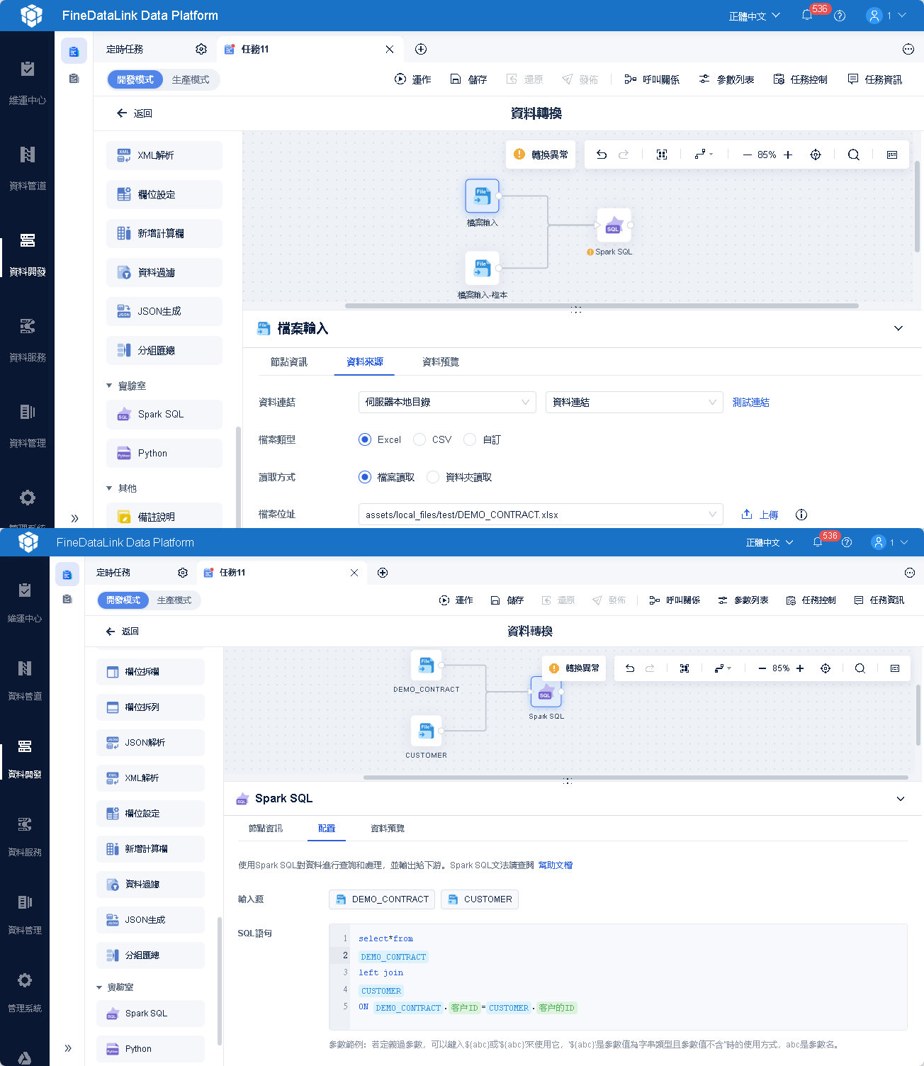 使用檔案輸入進行資料源輸入,然後使用「Spark SQL」進行資料計算,如下圖所示: