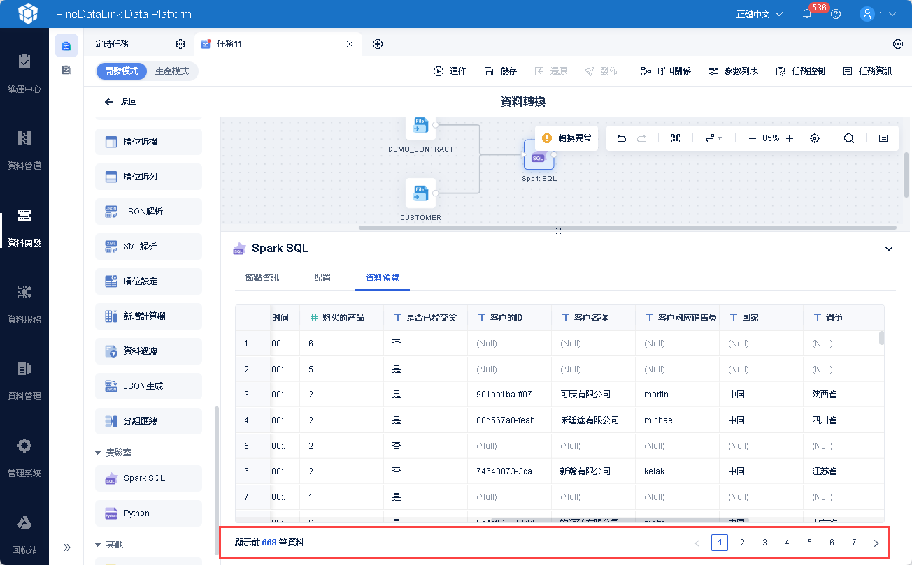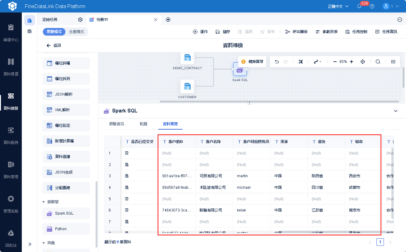 由於「CUSTOMER」資料表資料量較大,此時「樣本設定」預設取樣量為「5000」,即預覽介面用5000資料去參與運算。在資料聯動後「CUSTOMER」表中 5000 行之後的資料不參與計算,在資料結果預覽中就不能很好的確認計算是否正確,如下圖所示: