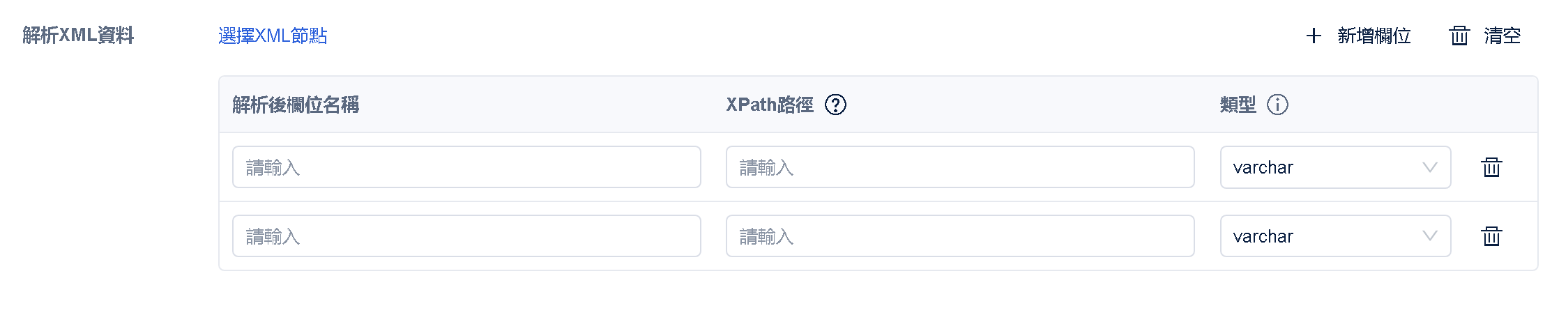 | XPath 路徑 | 1)可編輯;展示&配置解析後欄位的 XPath 路徑運算式 2)不允許引用參數 3)若需解析「選擇XML節點」無法生成的路徑,可點選「新增欄位」按鈕並手動填寫 XPath 路徑 |