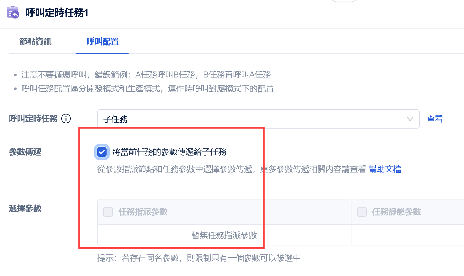 勾選了參數傳遞,任務定義的參數,子任務可以直接使用,但參數指派節點的參數只能被子任務的首個節點使用。