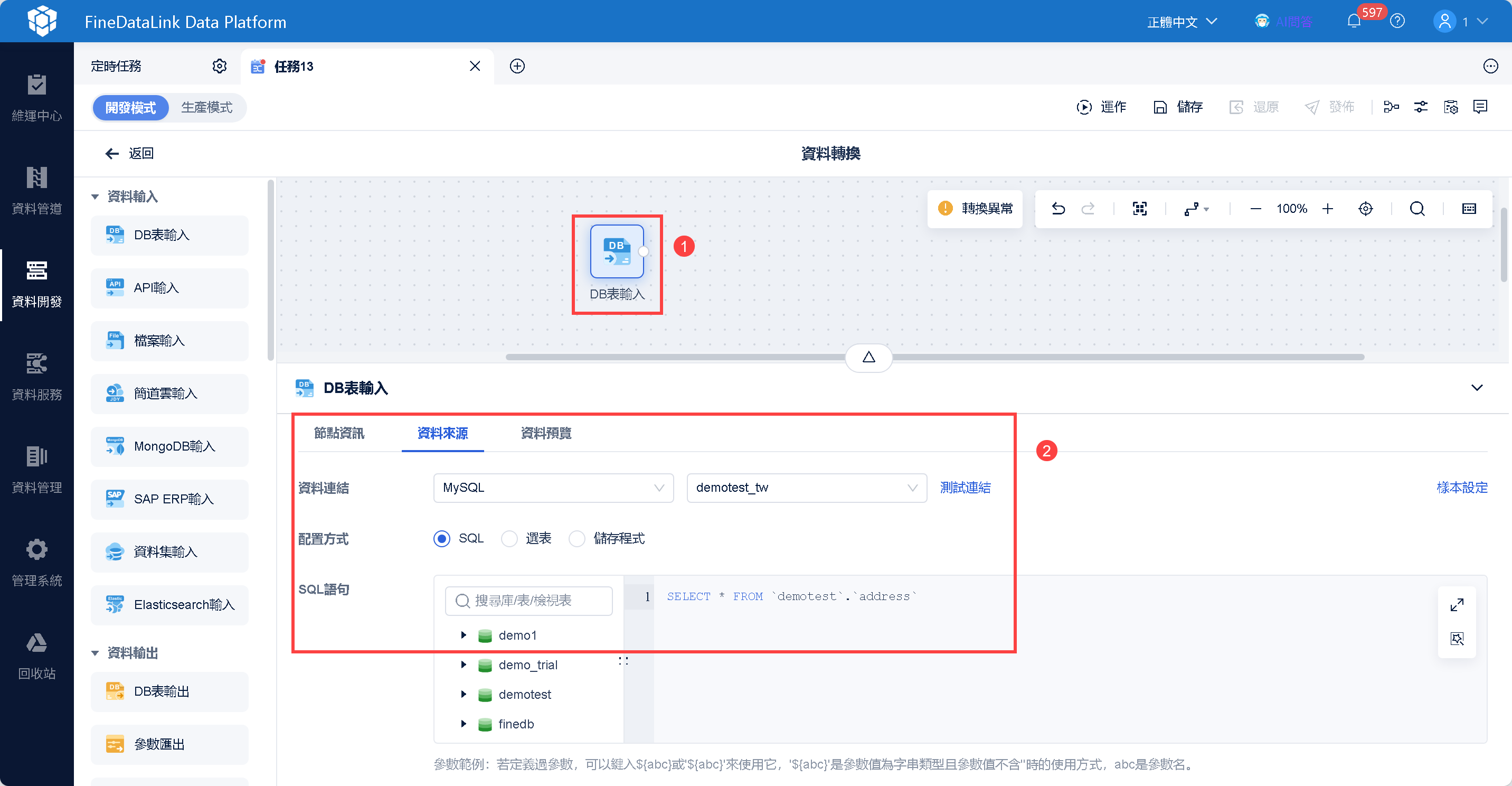 2)拖入「DB表輸入」算子,讀取要處理的表資料。如下圖所示: