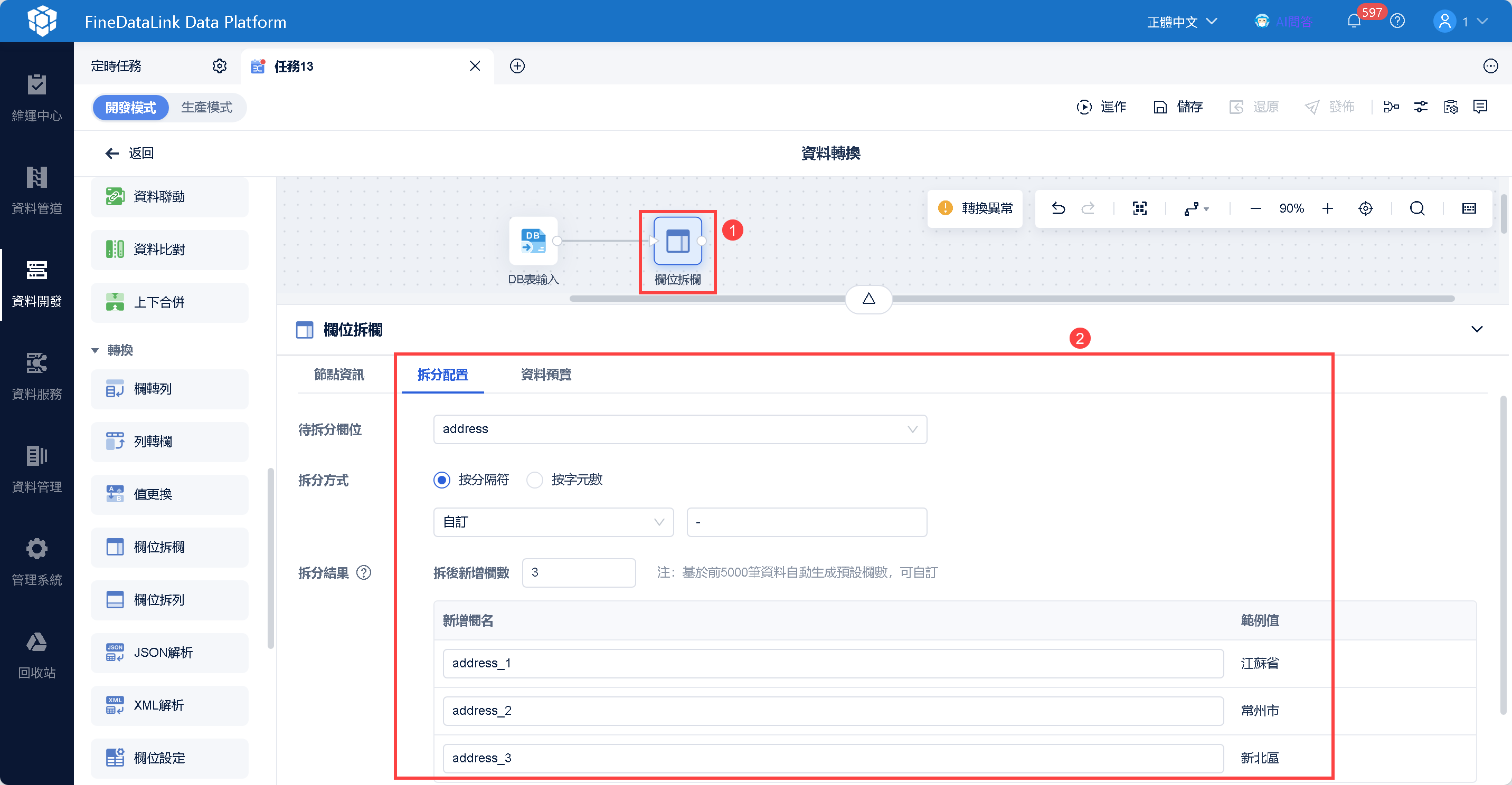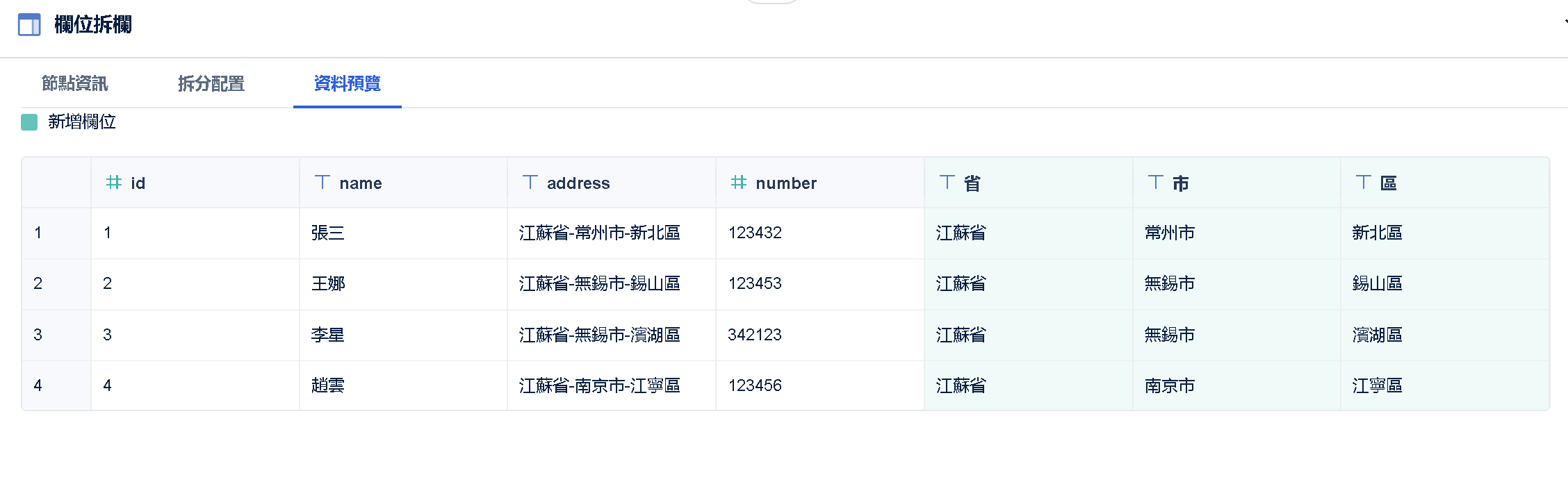 1)拖入「欄位拆列」算子,將 address 欄位拆分成多欄。如下圖所示: