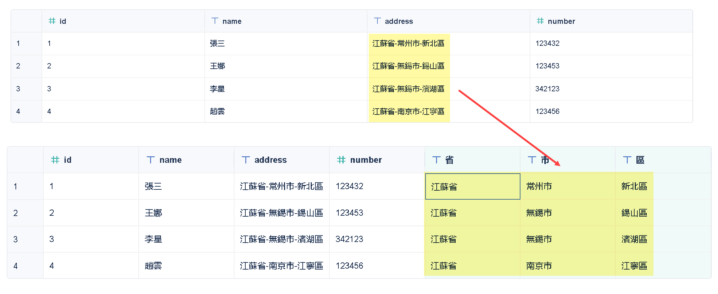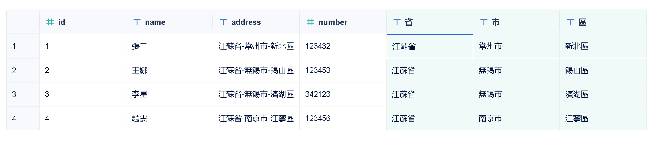 資料表中 address 欄位由省市區三部分組成,現在需要拆分成單獨的三列,拆分間隔符為-。如下圖所示: