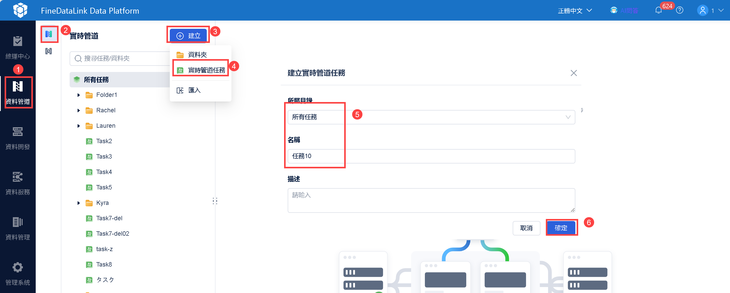 2)點選「資料管道>實時管道」,建立實時管道任務。如下圖所示: