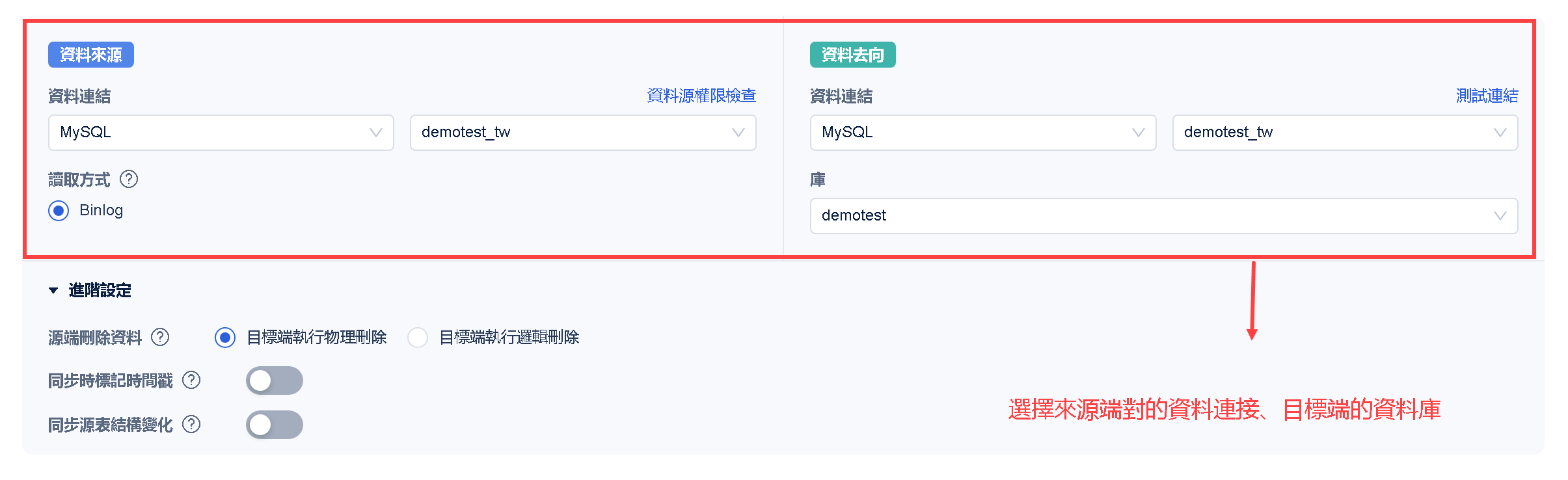 建立實時管道任務後,需要設定資料來源(來源端的資料連結)和資料去向(目標端的資料庫)。如下圖所示: