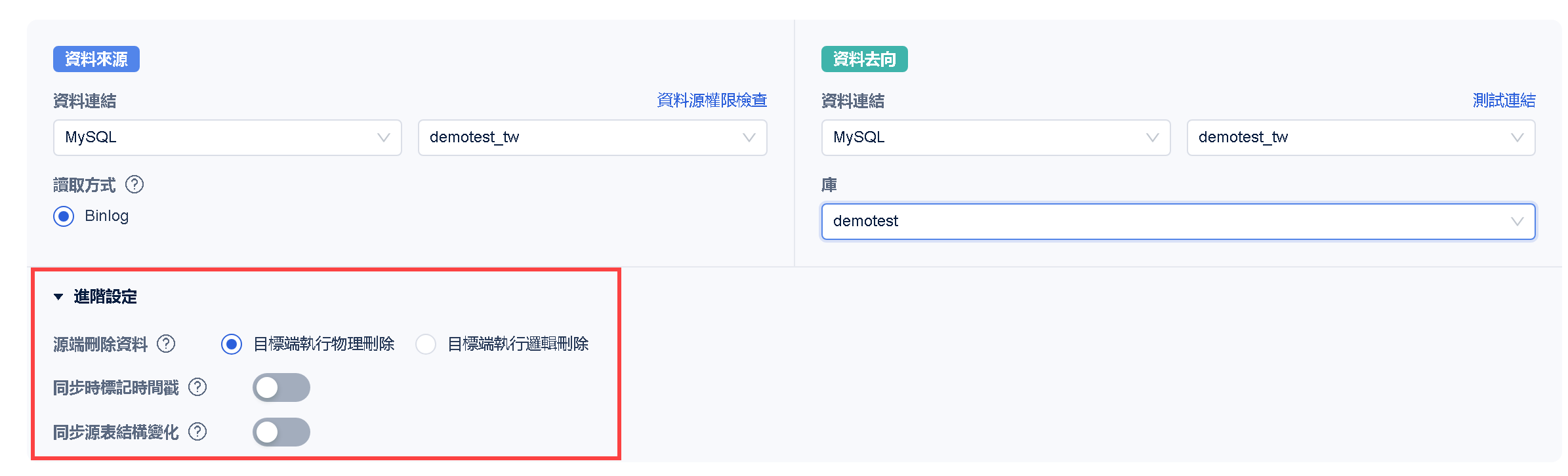 注:4.1.7.2 及之後版本,來源表若包含 _fdl_update_timestamp、_fdl_marked_deleted 欄位,實時同步時會遮蔽這些欄位。
