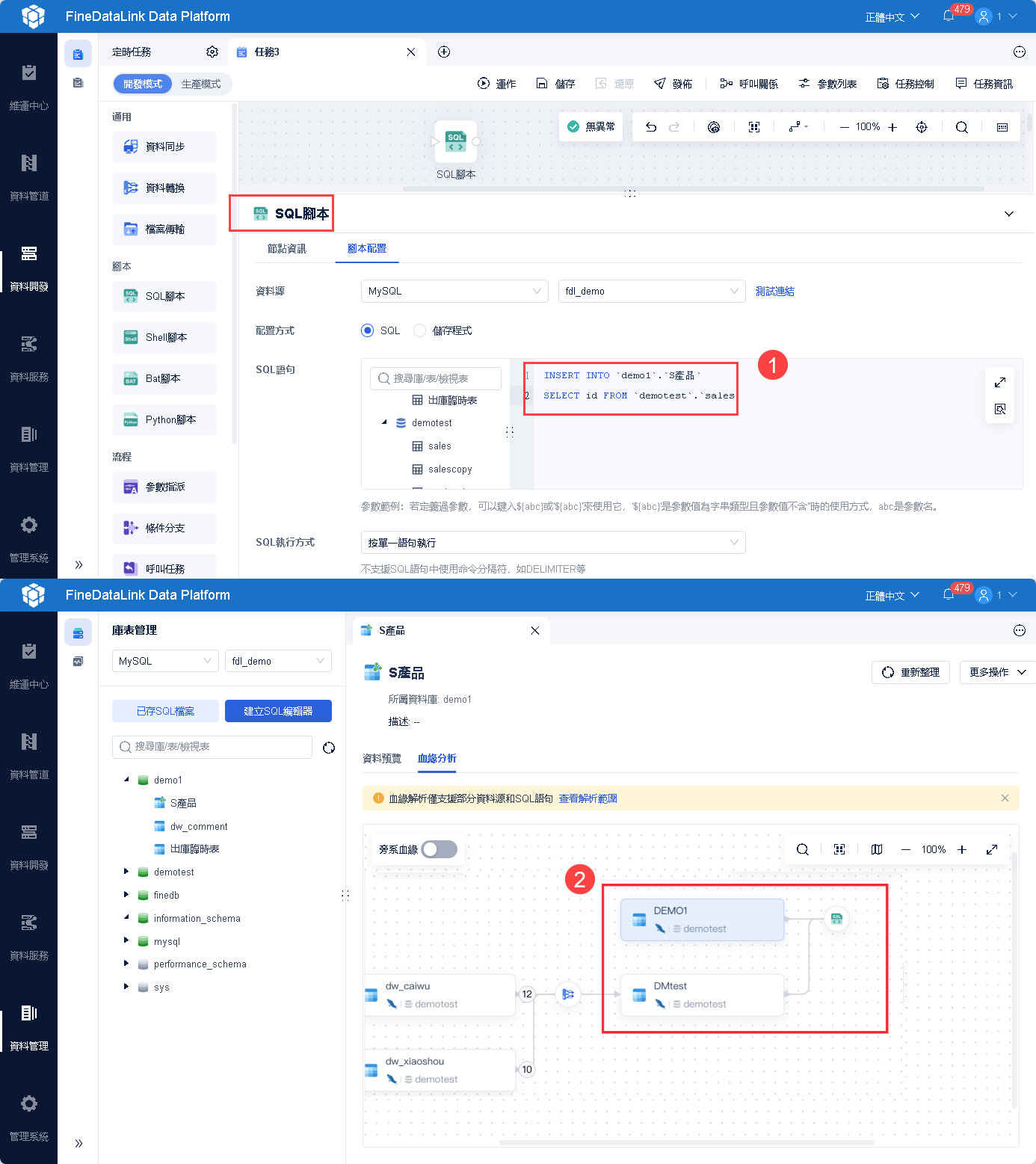 2)然後在「資料管理」下找到定時任務中的一個資料表 DEMO_PRODUCT,點選「血緣分析」,然後勾選「旁系血緣」,即可看到定時任務使用的資料表 SQL 語句血緣關係,如下圖所示: