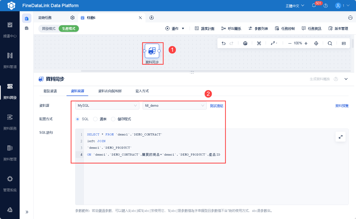 1)例如使用資料同步,SQL語句聯動兩張資料表,並將任務發佈至「生產模式」。如下圖所示: