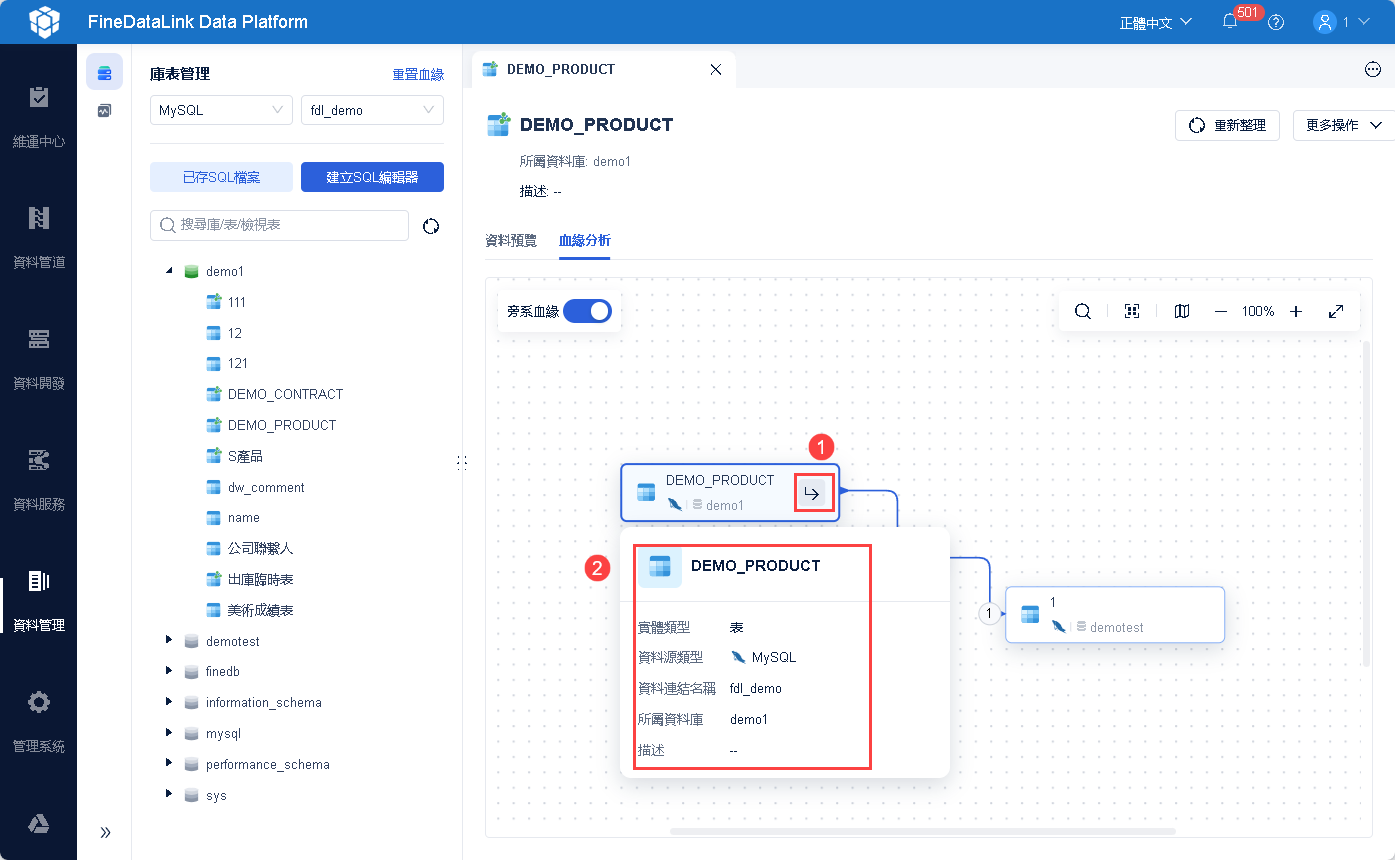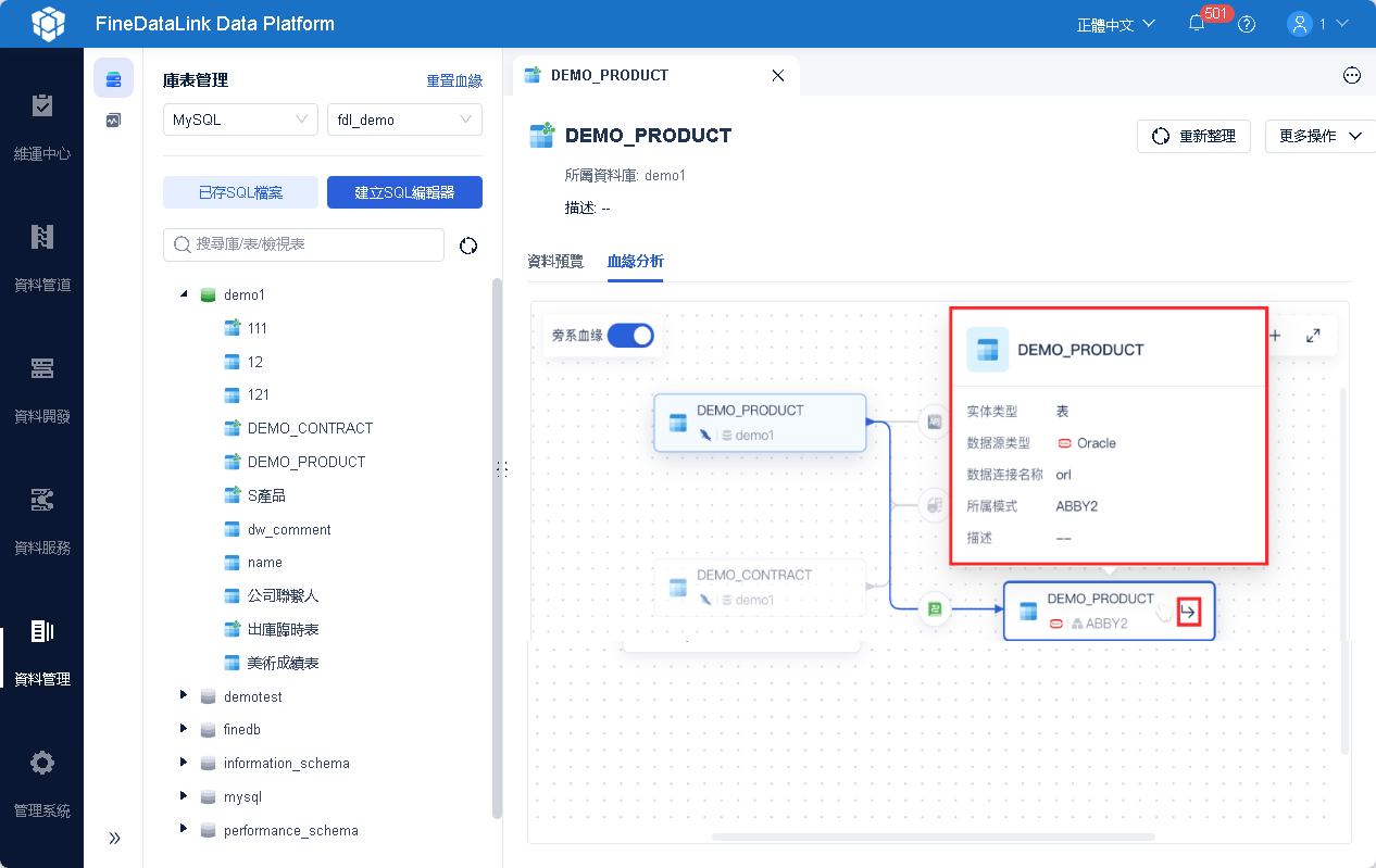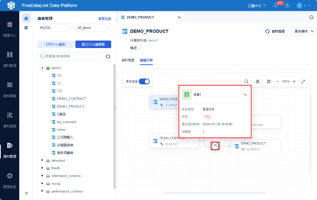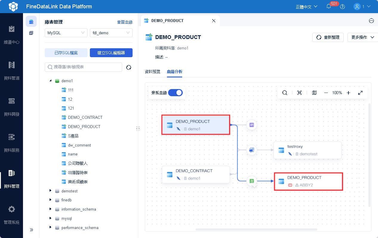 進入資料管理後,找到管道任務中的一個資料表 DEMO_PRODUCT,點選「血緣分析」,即可看到管道任務資料表的血緣,如下圖所示: