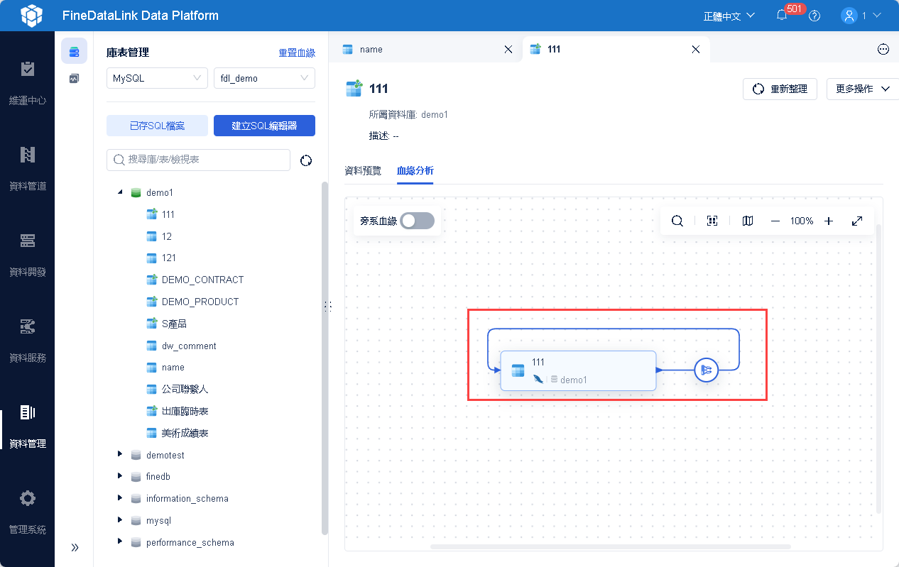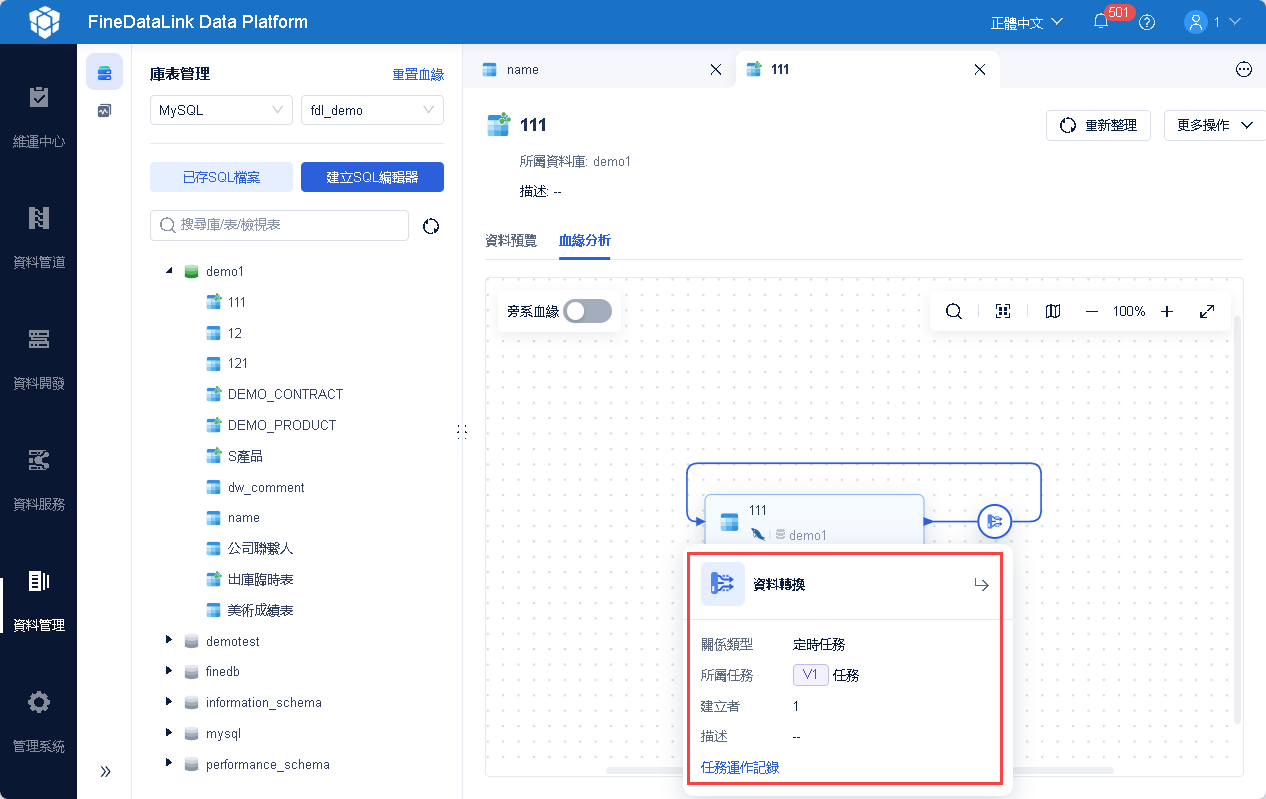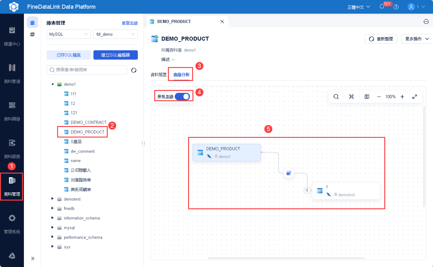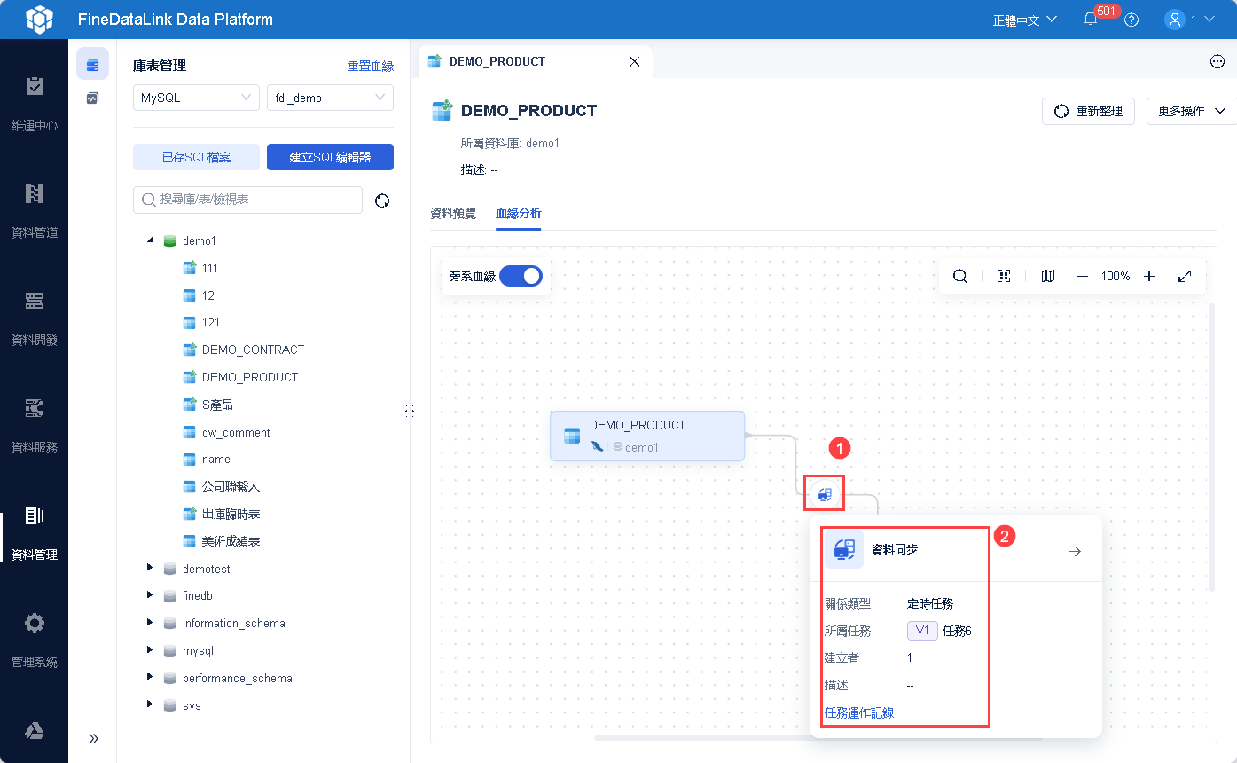 進入資料管理後,找到管道任務中的一個資料表 DEMO_PRODUCT,點選「血緣分析」,即可看到管道任務資料表的血緣,如下圖所示: