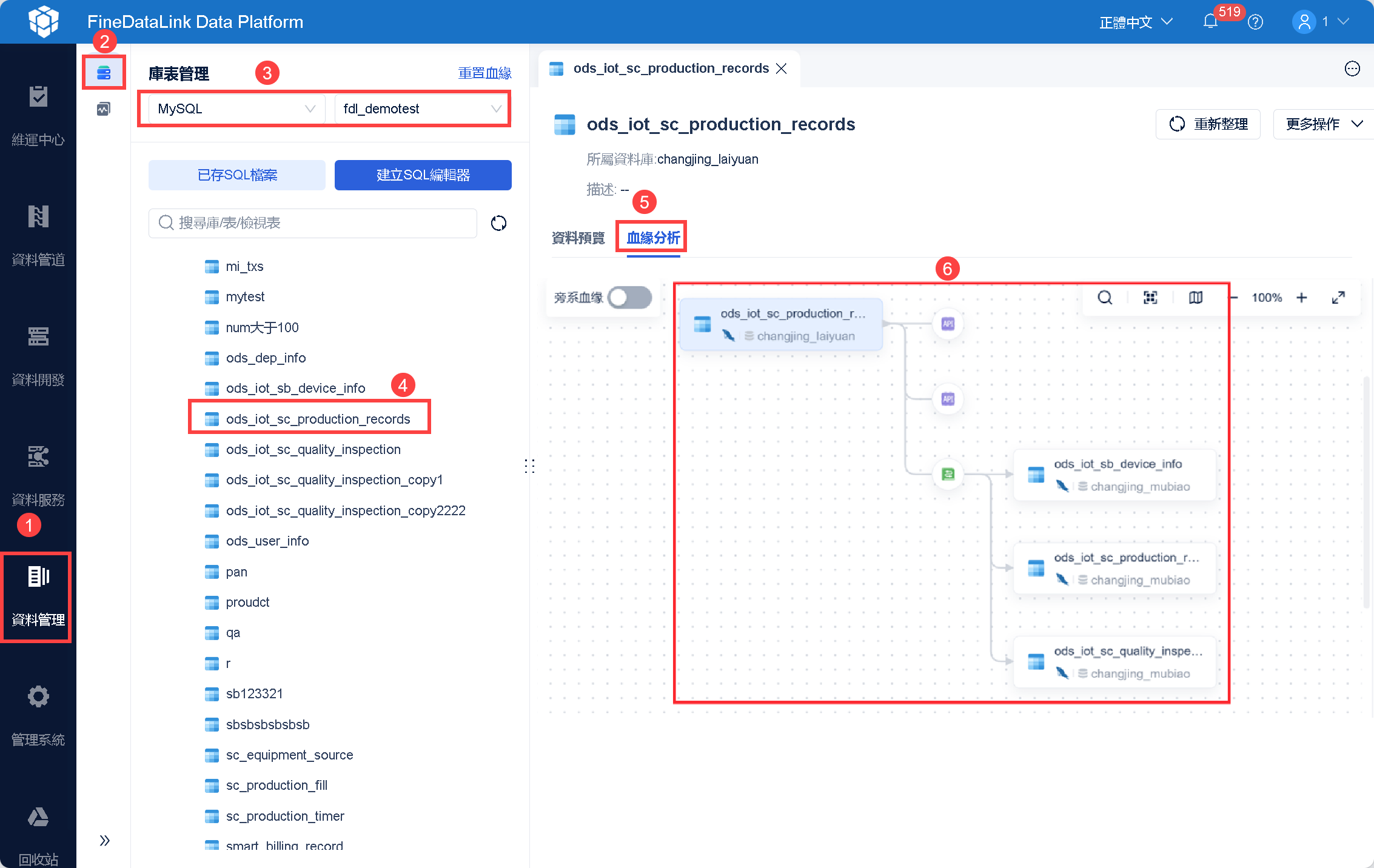 | 資料來源為 PostgreSQL 資料源 | 資料來源為 PostgreSQL 資料庫時,select 語句中包含的欄位名不能為 type,否則血緣分析功能將無法正常使用 |