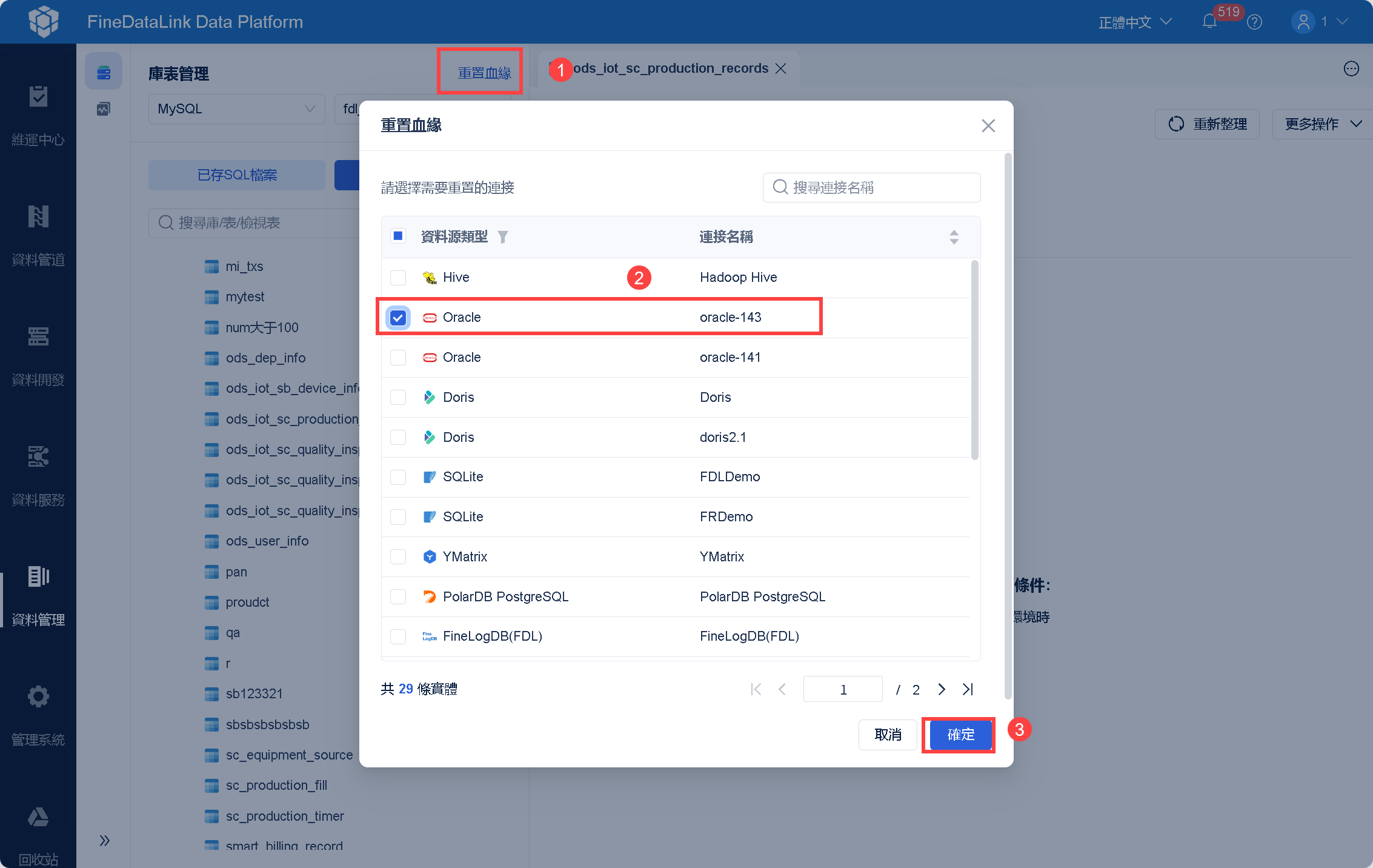 1)點選「重置血緣」按鈕,支援多選資料連結,如下圖所示:
