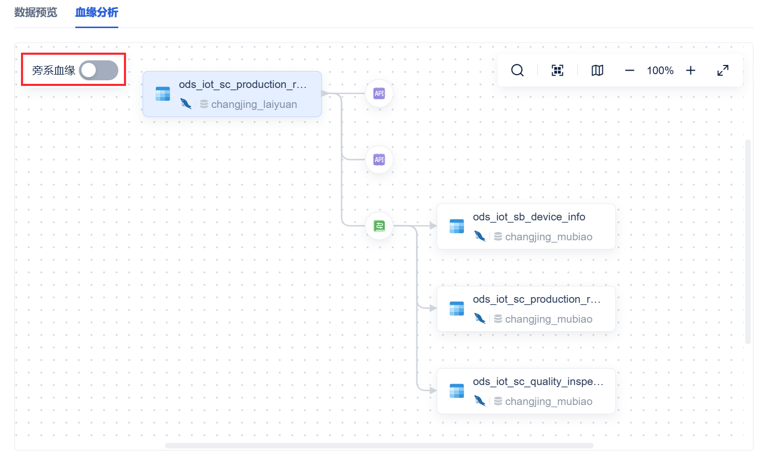 點選「資料管理>庫表管理」,選擇資料連結的某張表後,可查看資料表、API(資料服務)、定時任務節點、管道任務的血緣關係。如下圖所示: