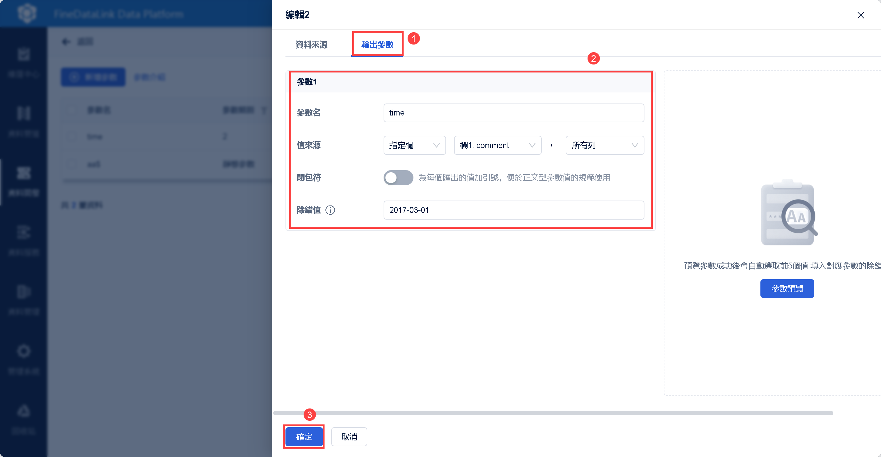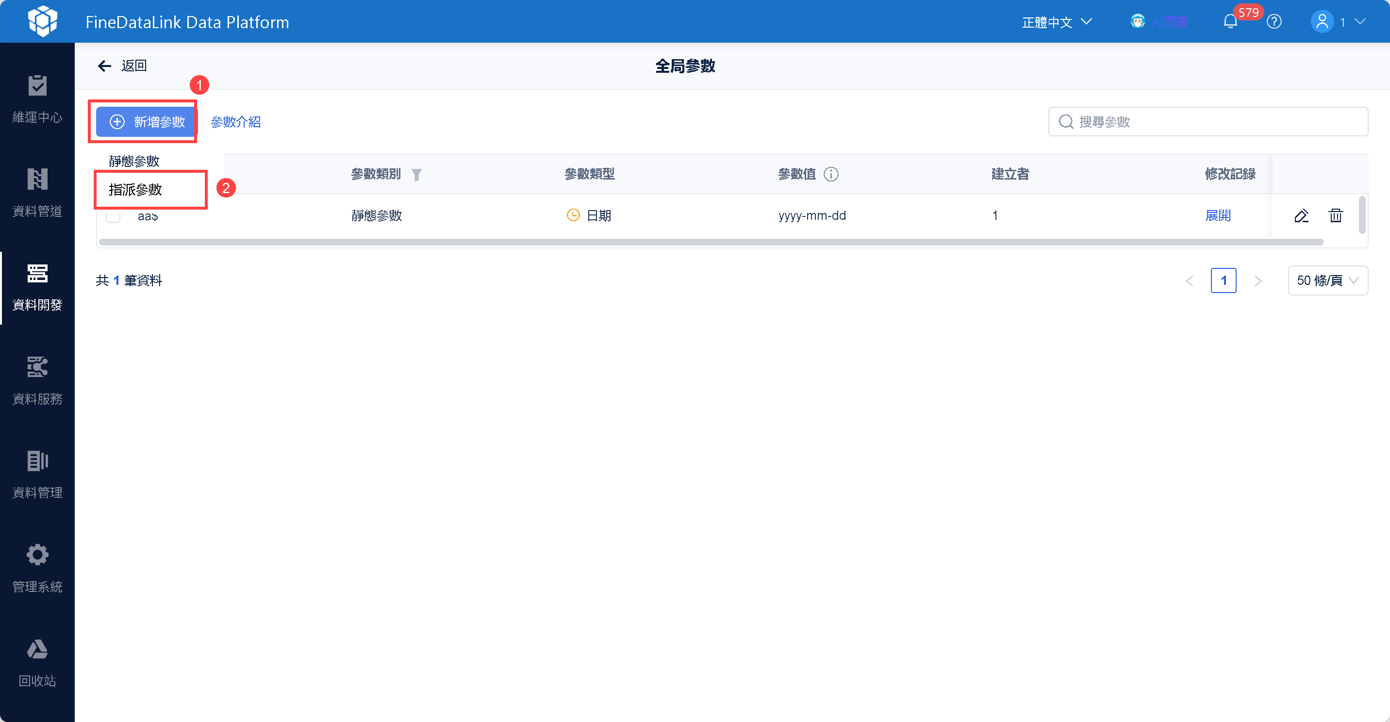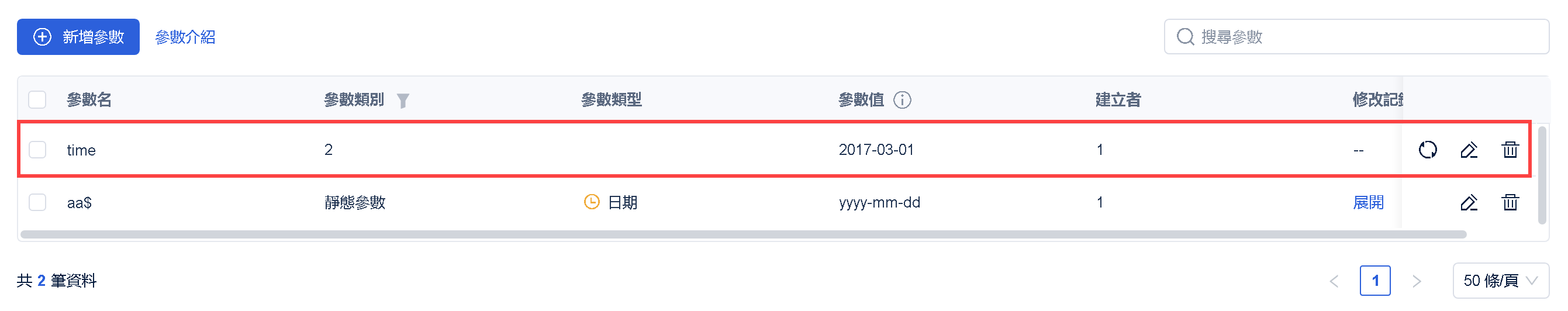 2)點選「新增參數」按鈕,可新增全局指派參數。例如希望從資料庫取出一欄時間作為參數,給多個定時任務使用。