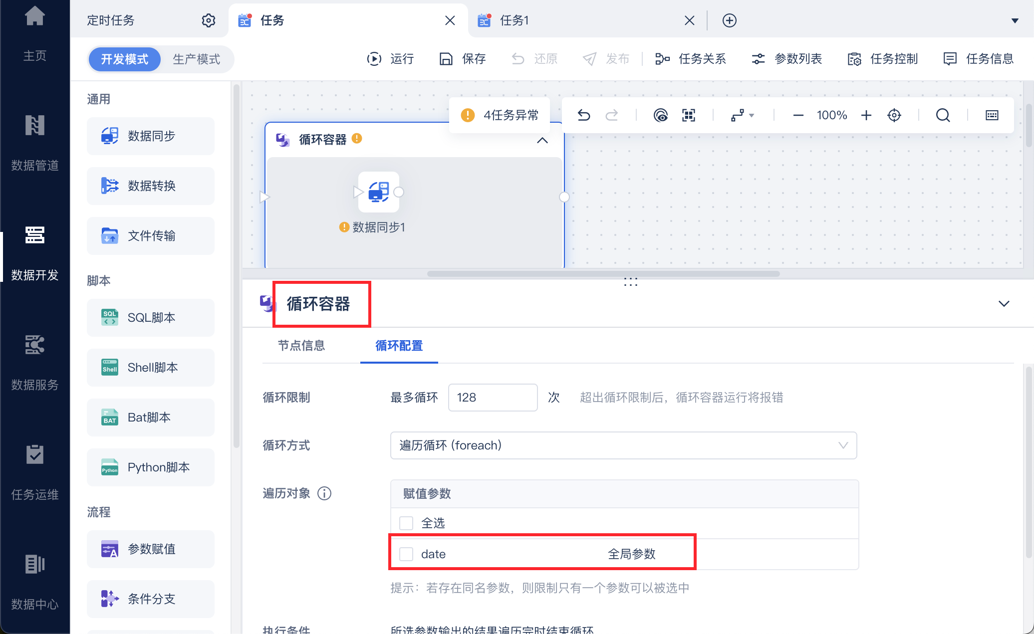 若循環容器使用該全局參數遍曆執行&循環容器裏有全局參數非循環參數,則任務執行前計算出該全局參數值再循環運作,容器中節點引用該參數時不重複計算參數值。
