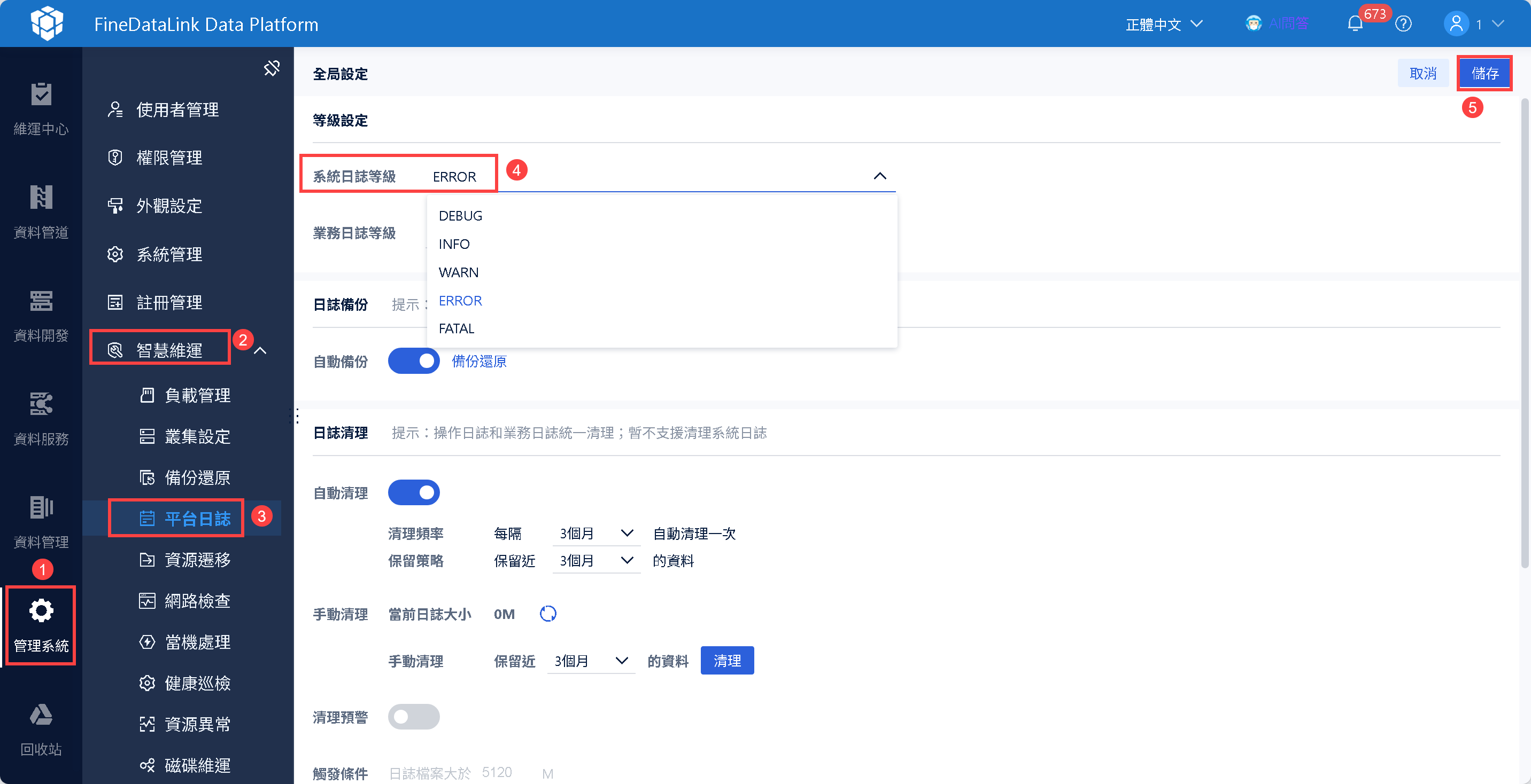 超級管理者登入 FineDataLink 系統,點選「管理系統>智慧維運>平台日誌」,點選「全局設定」,可根據需求自行調整日誌級別。如下圖所示: