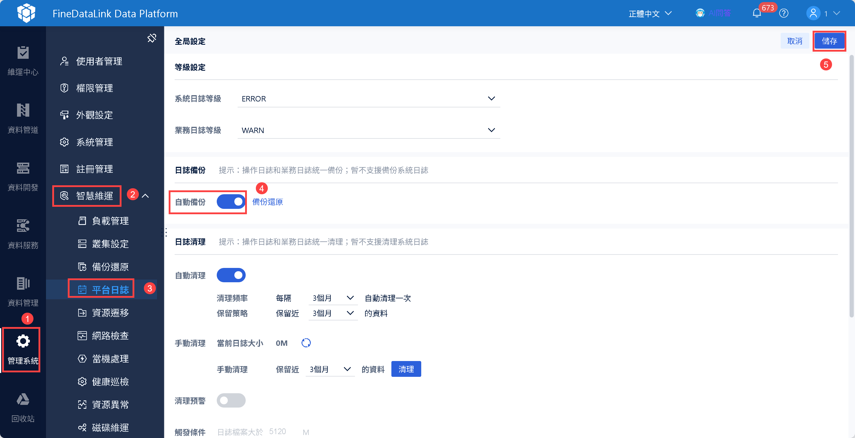管理者登入 FineDataLink 系統,點選「管理系統>智慧維運>平台日誌」,點選「全局設定」,可開啟「自動備份」按鈕。如下圖所示: