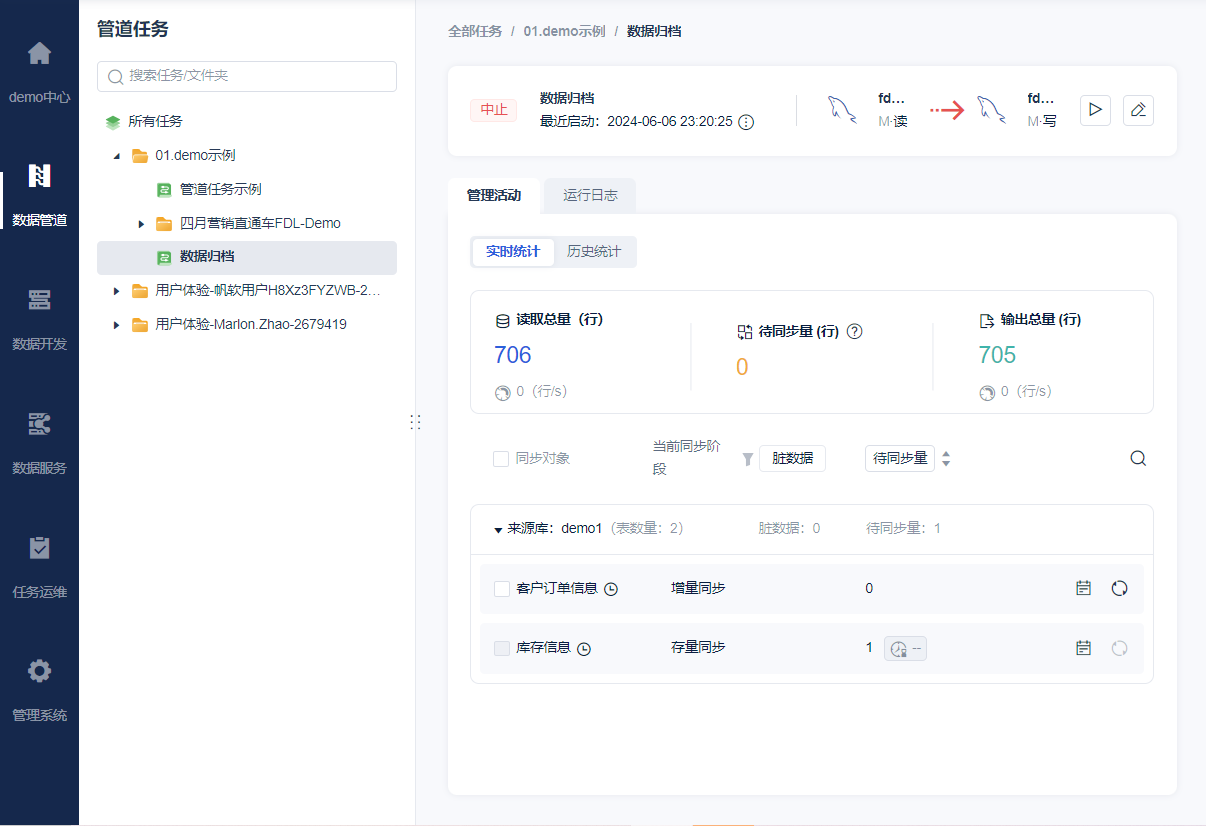 业务数据库 demo1 中存放着「客户订单」表、「库存」表,这两张表每天都会接收大量新增数据、部分更新数据,为保证业务数据库的性能,希望将这两张表信息备份到归档库 demotest2 中。同时,想避免数据分析工具对业务数据库的读取压力(数据分析工具对近三年数据进行分析)。