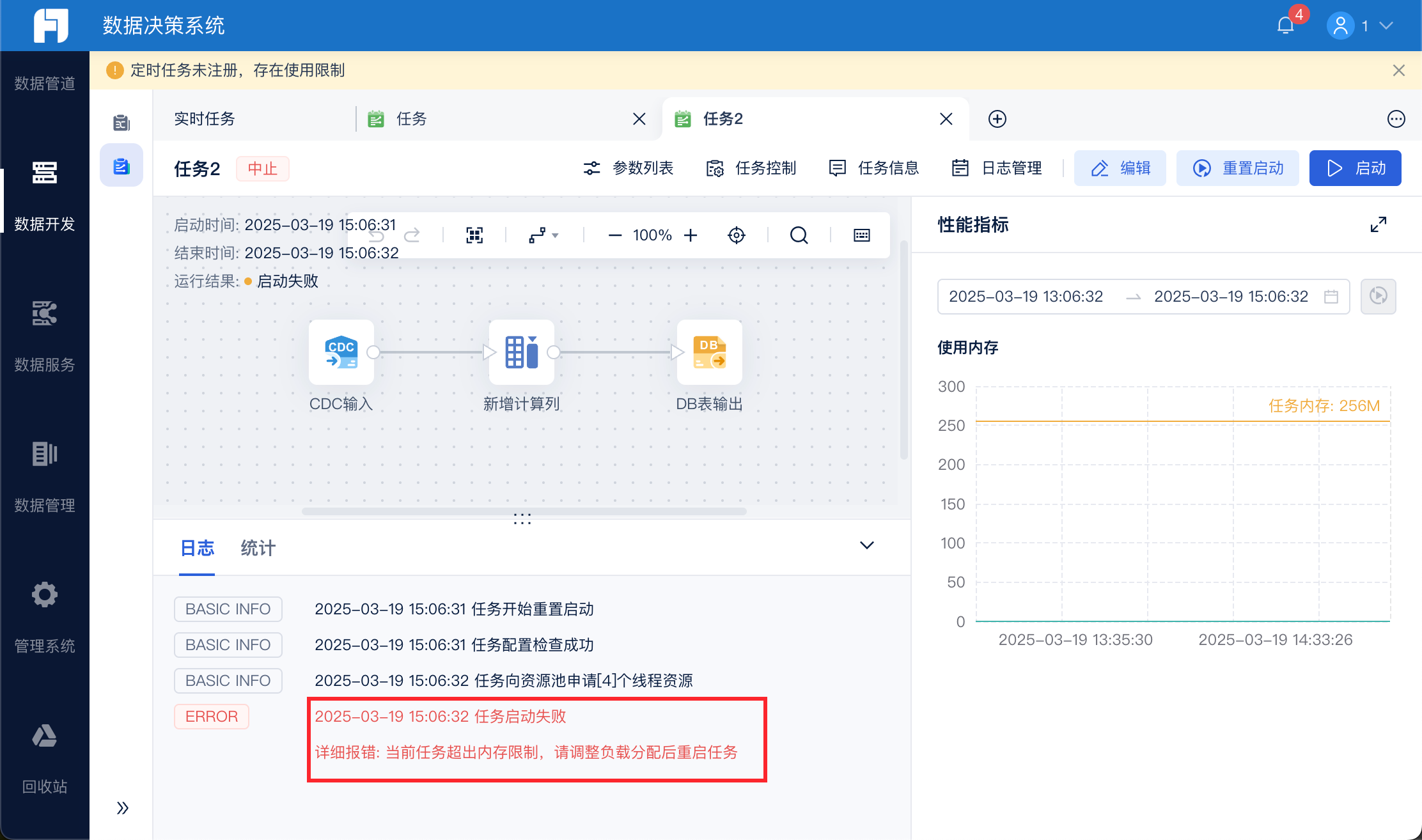 用户开发了一个实时任务,想要运行看看效果,在首次运行任务的时候,若任务报错超出资源限制,如下图所示: