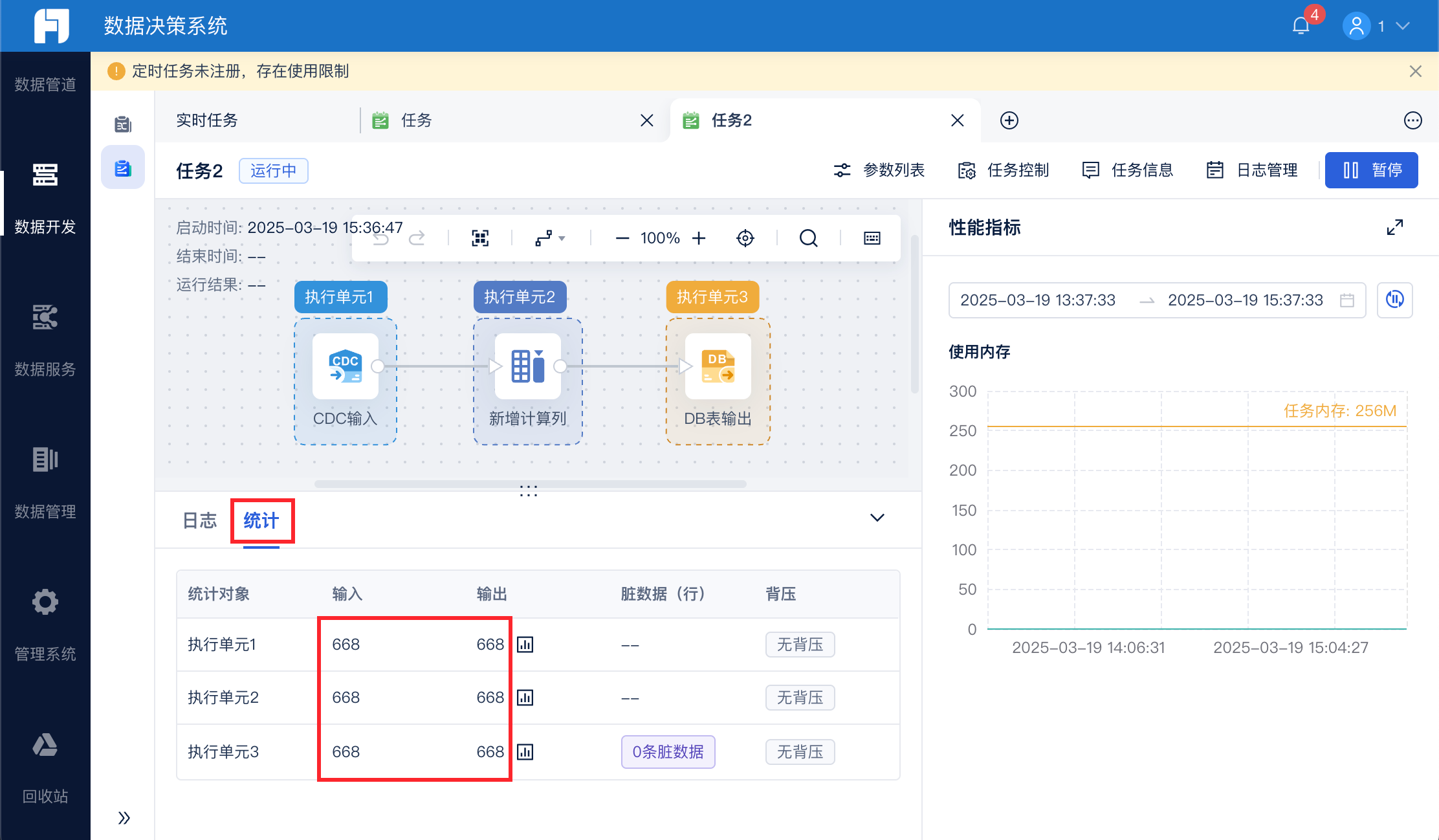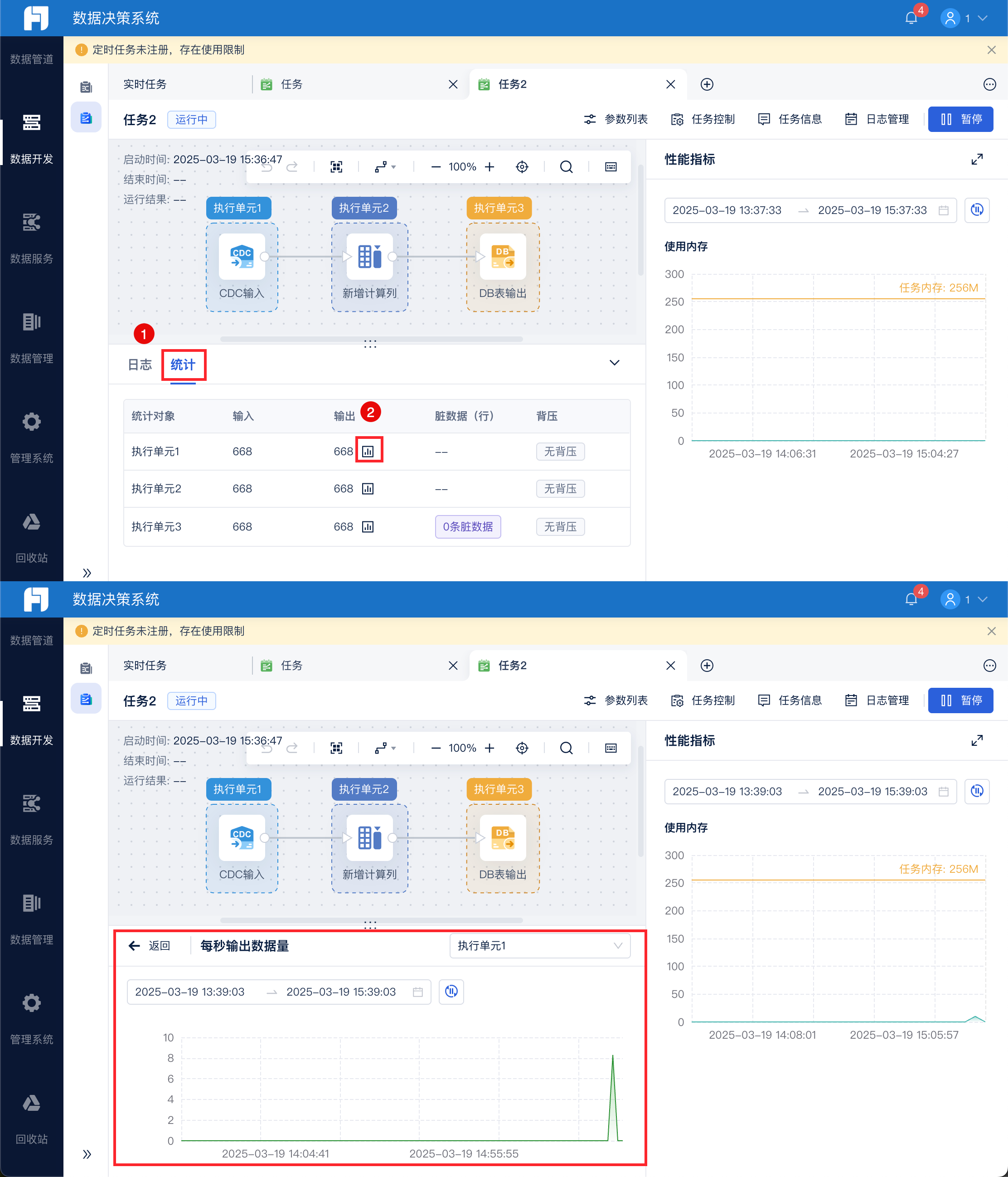 用户想要查看数据同步的数量,确定是否符合自己的预期,并排查算子间处理是否丢数据。此时可以点击「统计」,看到每一个算子的输入、输出情况,以及每个执行单元的每秒输出数据量,如下图所示: