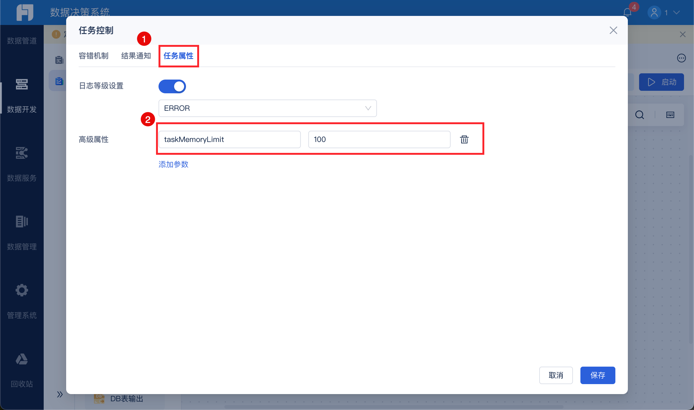 可以在任务编辑界面(任务暂停运行)设置「任务控制>任务属性」,设置内存,如下图所示: