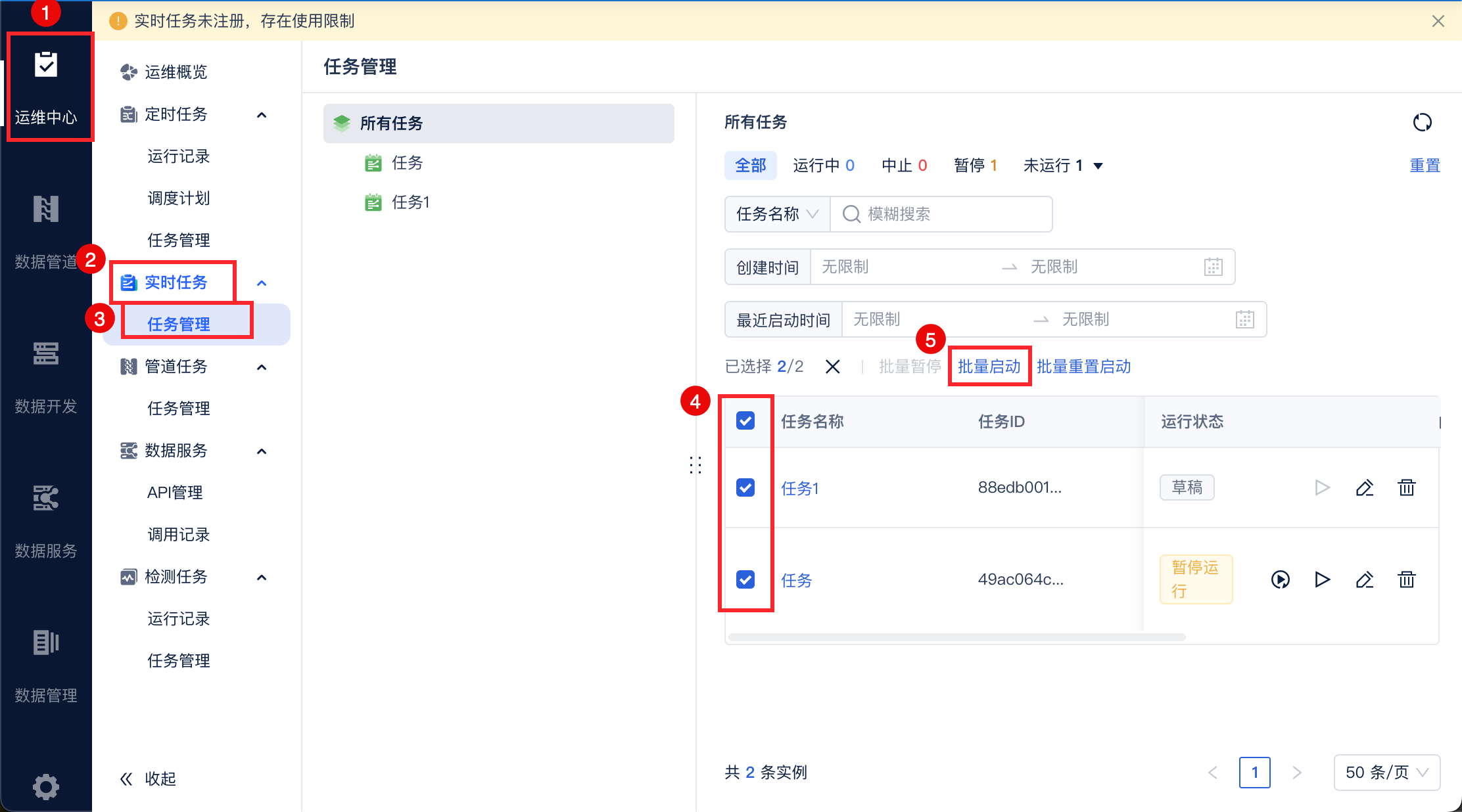 当因为工程重启或者源端导致任务暂停时,想要把所有任务都批量运行起来,此时可以在运维中心进行批量启动,如下图所示: