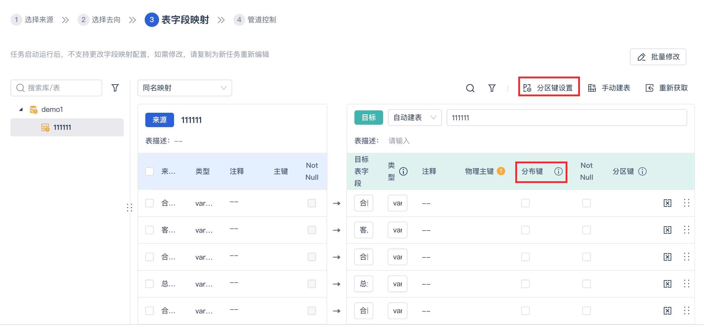 4.1.9.3 及之后的版本,管道任务自动建表支持指定分区和分布键,如下图所示: