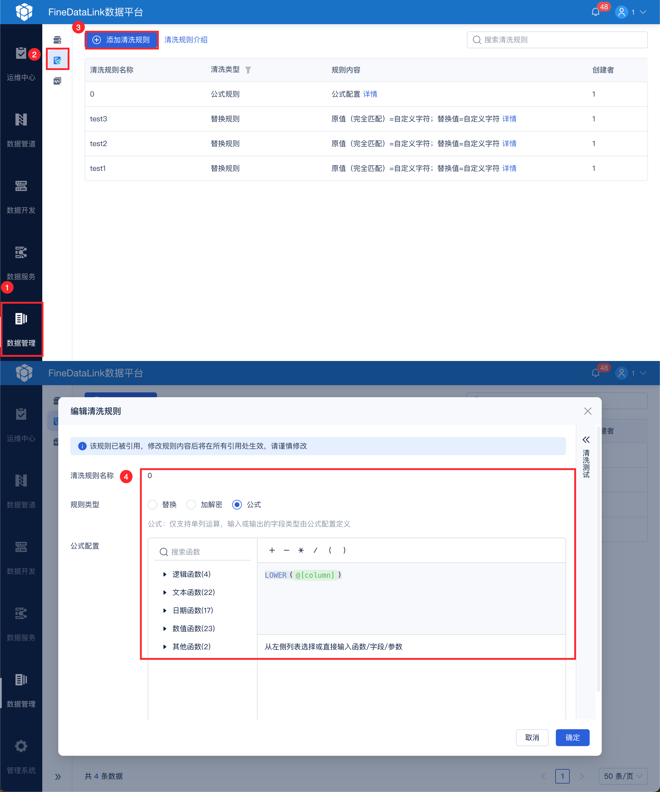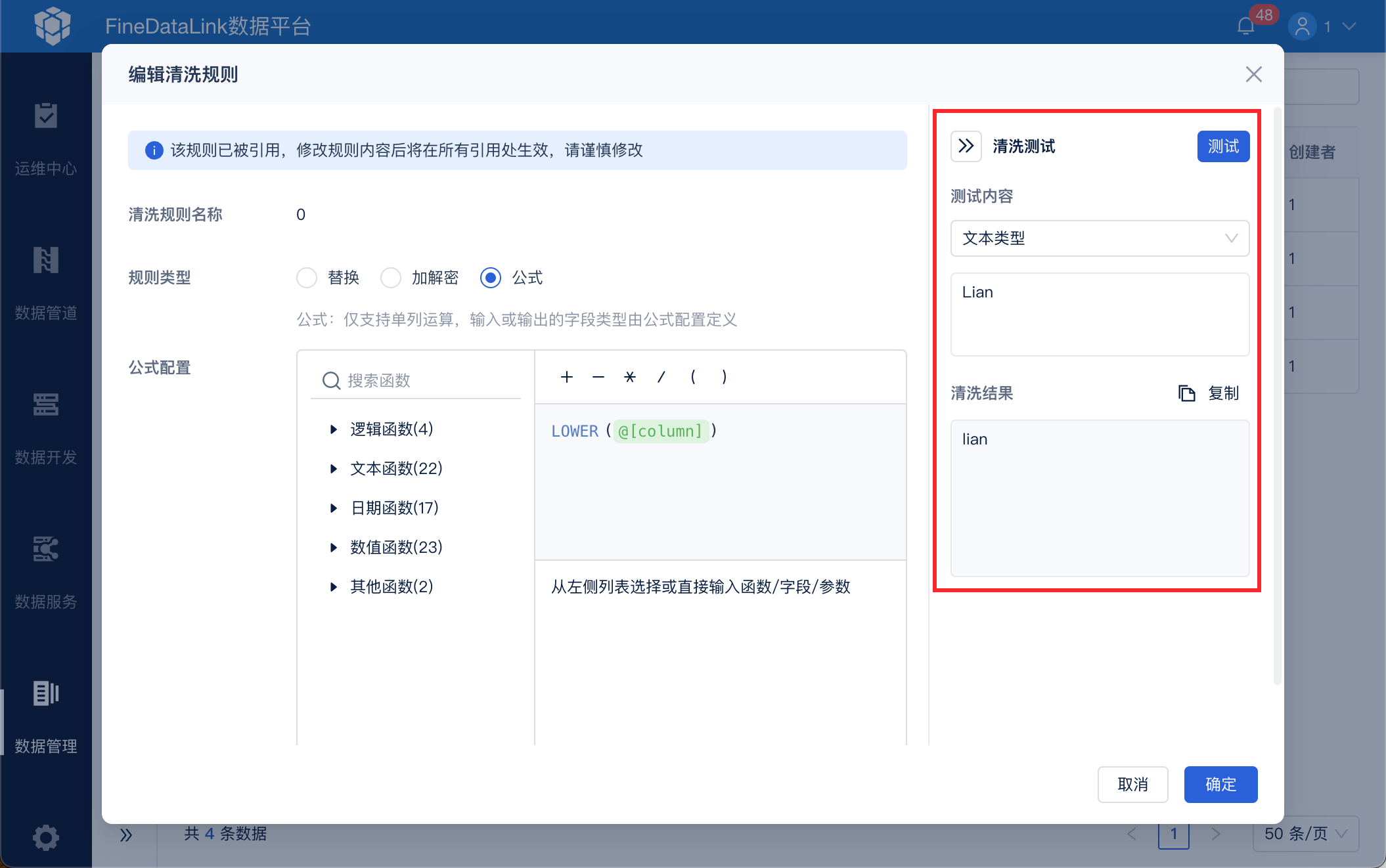 在数据管理下选择「清洗规则」,新建全局清洗规则,设置规则类型为公式,公式:LOWER(@[column]),也就是将字段值中的大写都改成小写,如下图所示: